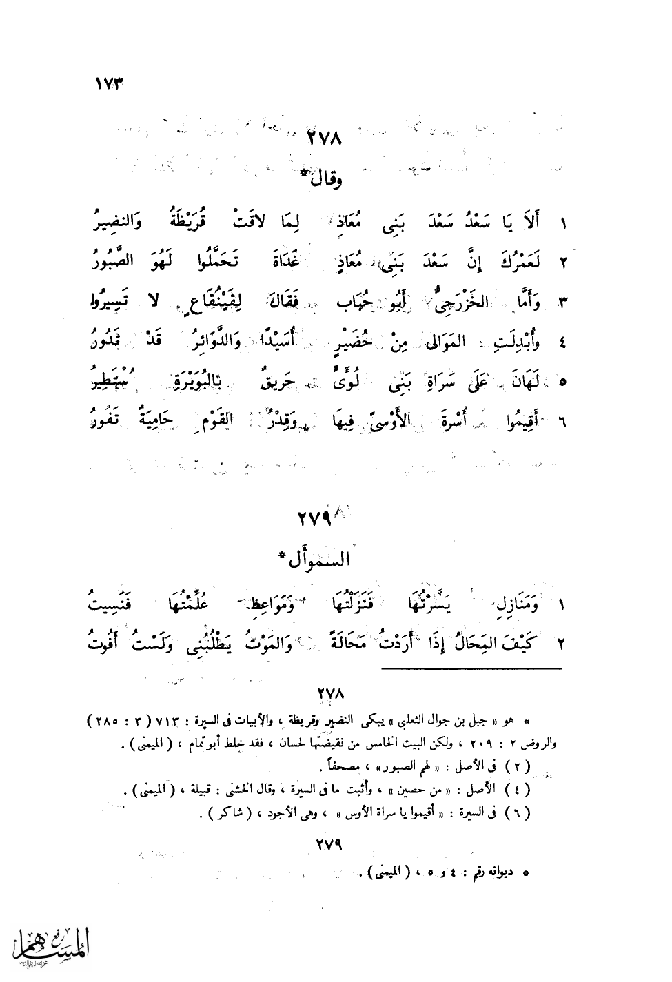 ألاَ يَا سَعْدُ سَعْدَ بَني مُعَاذٍ ... لِمَا لاَقَتْ قُرَيْظَةُ وَالنَّضِيرُ