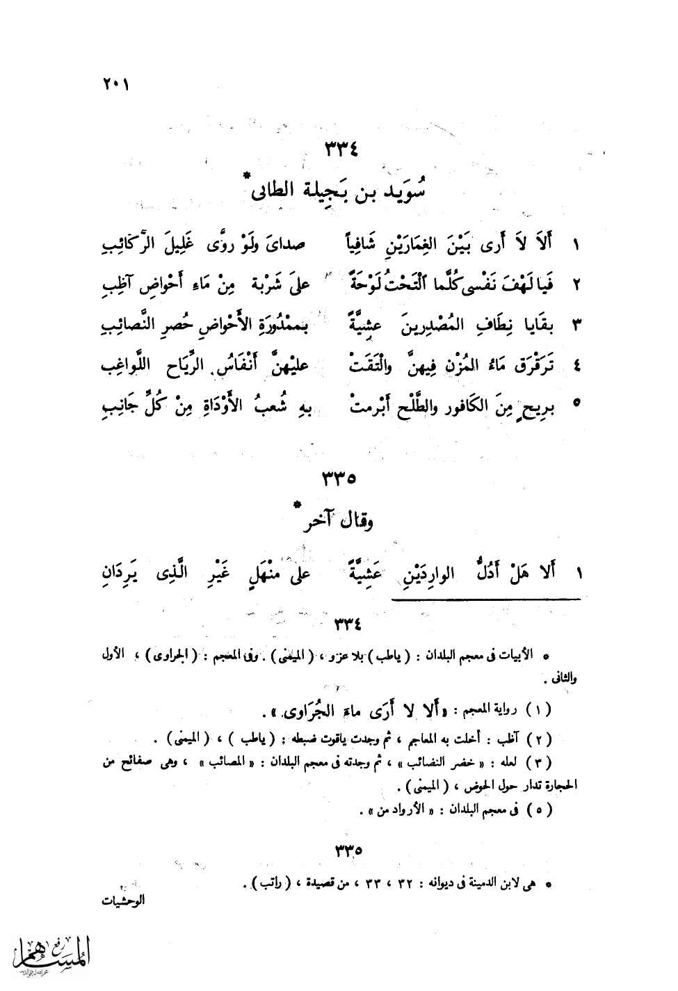 أَلاَ هَلْ أَدُلُّ الوَارِدَيْنِ عَشيَّةً ... عَلَى مَنْهَلٍ غَيْرِ الذَّي يَرِدَانِ