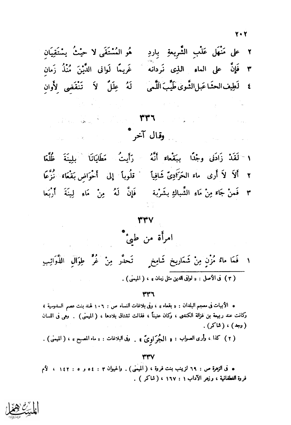 عَلَى مَنْهَلٍ عَذْبِ الشَّرِيعَةِ بارِدٍ ... هُوَ المُسْتَقَى لاَ حَيْثُ يَسْتَقِيَانِ