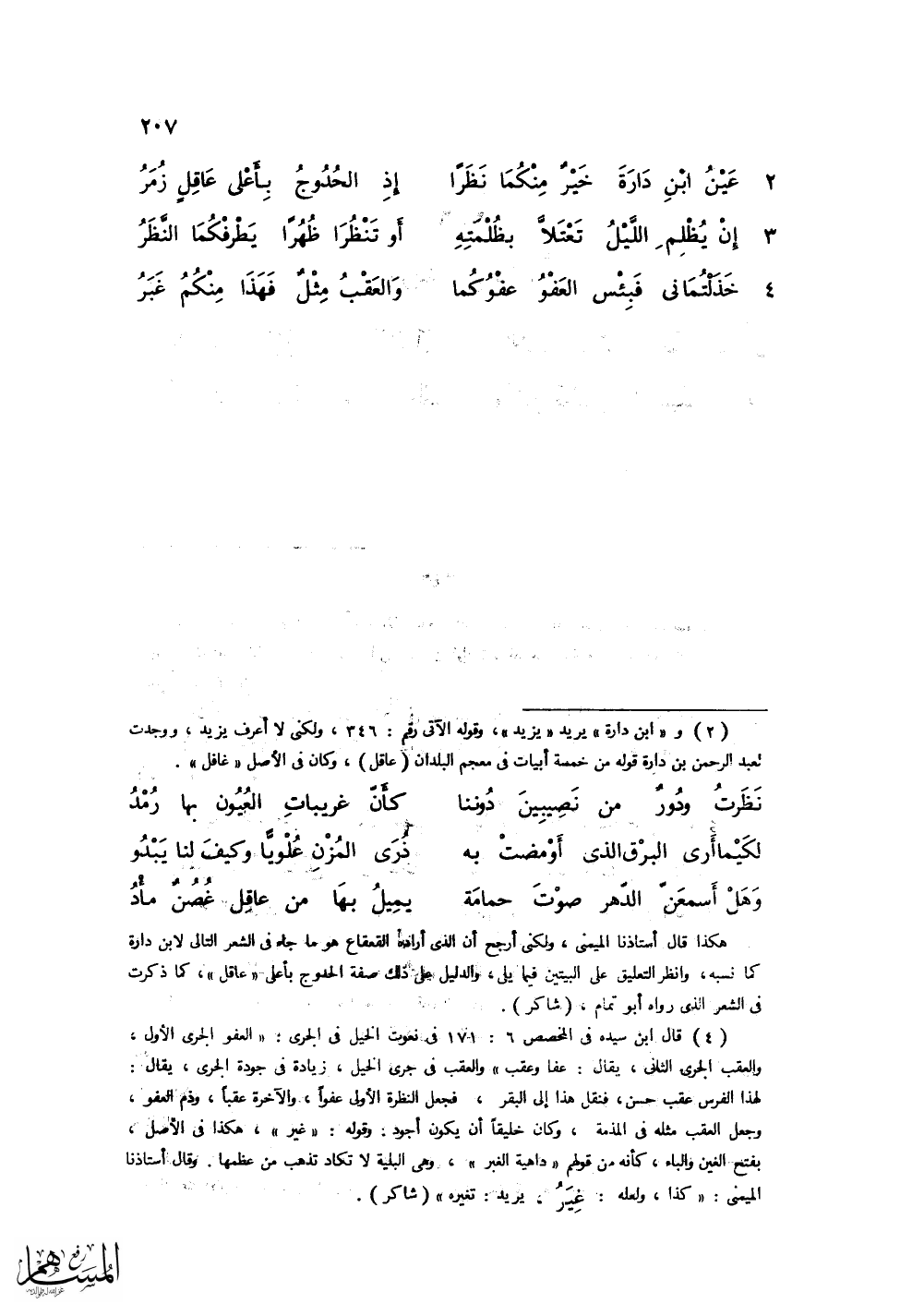 عَيْنُ ابْنِ دَارَةَ خَيْرٌ مِنْكُمَا نَظَراً ... إذِ الحُدُوجُ بِأعْلَى عَاقِلٍ زُمَرُ