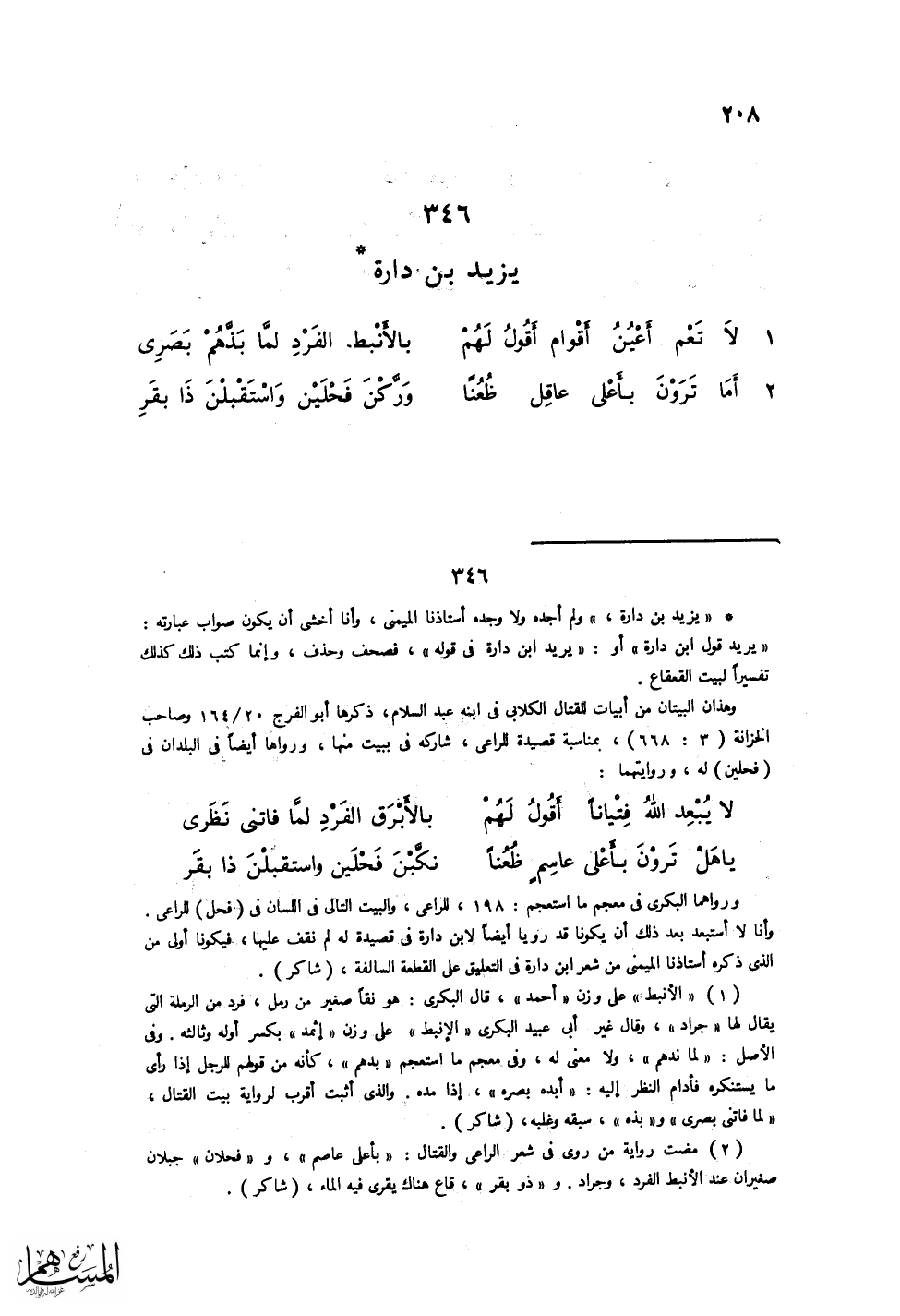 لاَ تَعْمَ أَعْيُنُ أَقْوَامٍ أقُولُ لَهُمْ ... بالأَنْبَطِ الفَرْدِ لمَّا بَذَّهُمْ بَصَرِي
