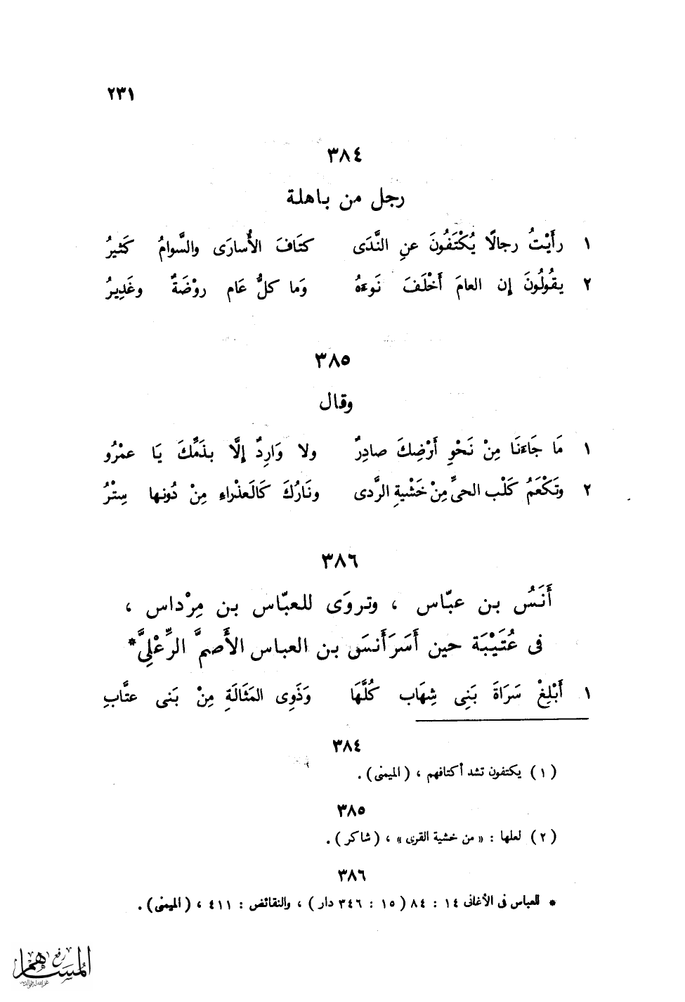 رَأيتُ رِجَالاً يُكْتَفُونَ عَنِ النَّدَى ... كِتَافَ الأُسَارَى والسَّوامُ كَثيِرُ
