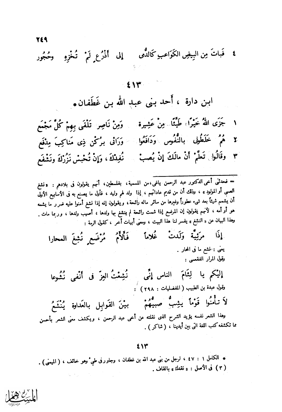 جَزَى اللهُ خَيْراً طَيِّئاً مِنْ عَشِيرَةٍ ... ومَنْ نَاصِرٍ تَلْقَى بِهِمْ كُلِّ مَجْمَعِ