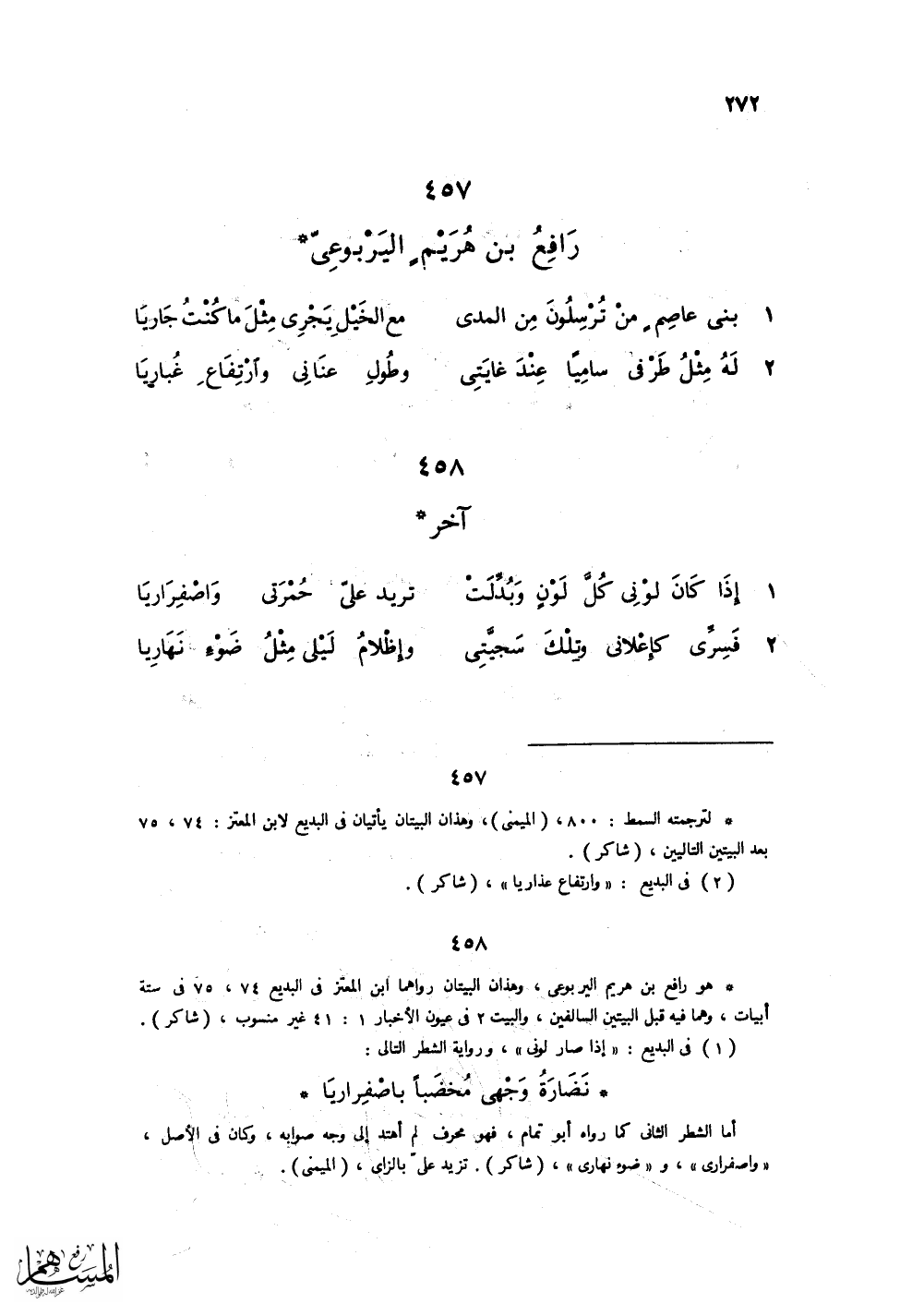 بَنِي عَاصِمٍ مَنْ تُرْسِلُونَ مِنَ المَدَى ... مَعَ الخيْلِ يَجْرِي مِثْلَ مَا كُنْتُ جَاريَا