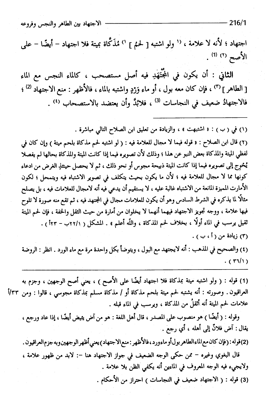 الثَّانِي أَن يكون فى الْمُجْتَهد فِيهِ أصل مستصحب كَالْمَاءِ النَّجس مَعَ المَاء الطَّاهِر فَإِن كَانَ مَعَه بَوْل أَو مَاء ورد واشتبه بِالْمَاءِ فَالْأَظْهر منع الِاجْتِهَاد فالاجتهاد ضَعِيف فى النَّجَاسَات فَلَا بُد وَأَن يعتضد بالاستصحاب