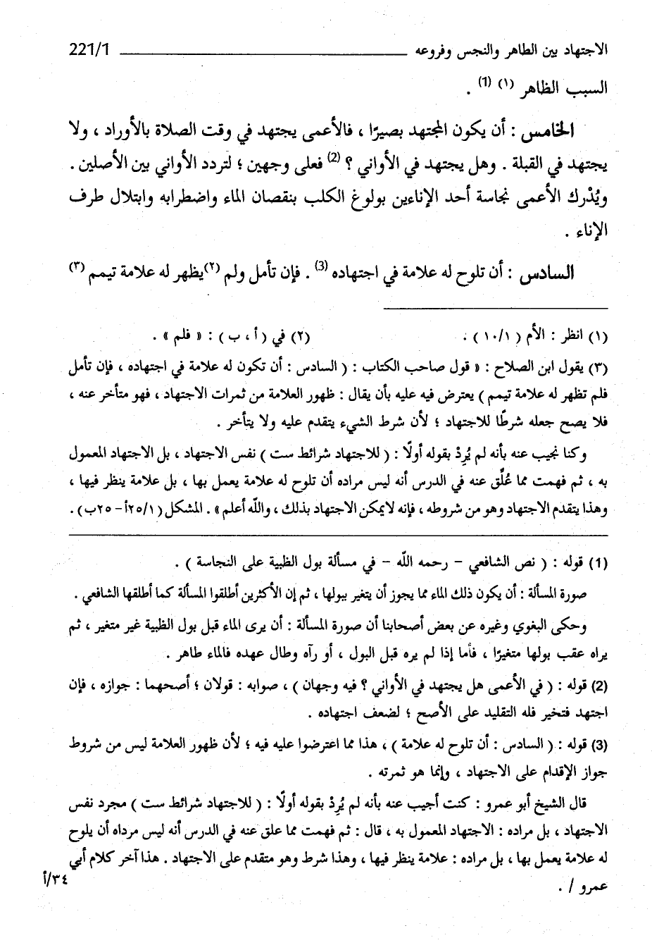 الْخَامِس أَن يكون الْمُجْتَهد بَصيرًا فالأعمى يجْتَهد فِي وَقت الصَّلَاة بالأوراد وَلَا يجْتَهد فى الْقبْلَة وَهل يجْتَهد فِي الْأَوَانِي فعلى وَجْهَيْن لتردد الْأَوَانِي بَين الْأَصْلَيْنِ
