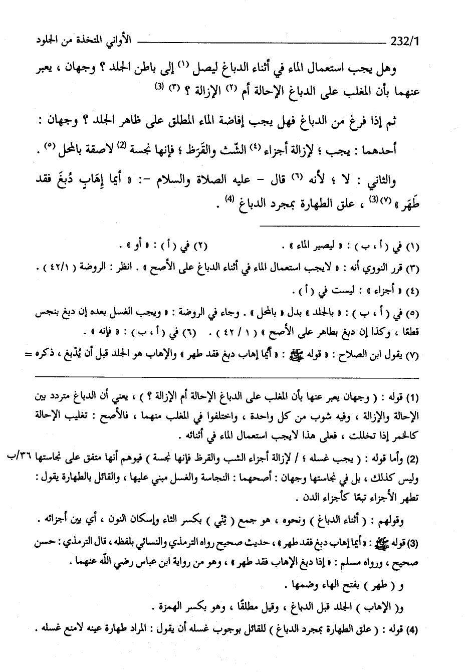 وَهل يجب اسْتِعْمَال المَاء فِي أثْنَاء الدّباغ ليصل إِلَى بَاطِن الْجلد وَجْهَان يعبر عَنْهُمَا بِأَن الْمُغَلب على الدّباغ الإحالة أم الْإِزَالَة