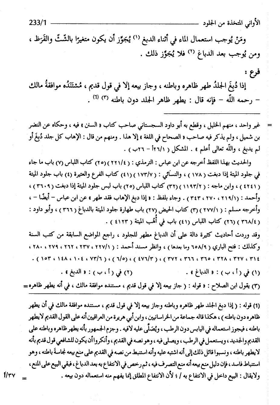 إِذا دبغ الْجلد طهر ظَاهره وباطنه وَجَاز بَيْعه إِلَّا فى قَول قديم مُسْتَنده مُوَافقَة مَالك رَحمَه الله فَإِنَّهُ قَالَ يطهر ظَاهر الْجلد دون بَاطِنه