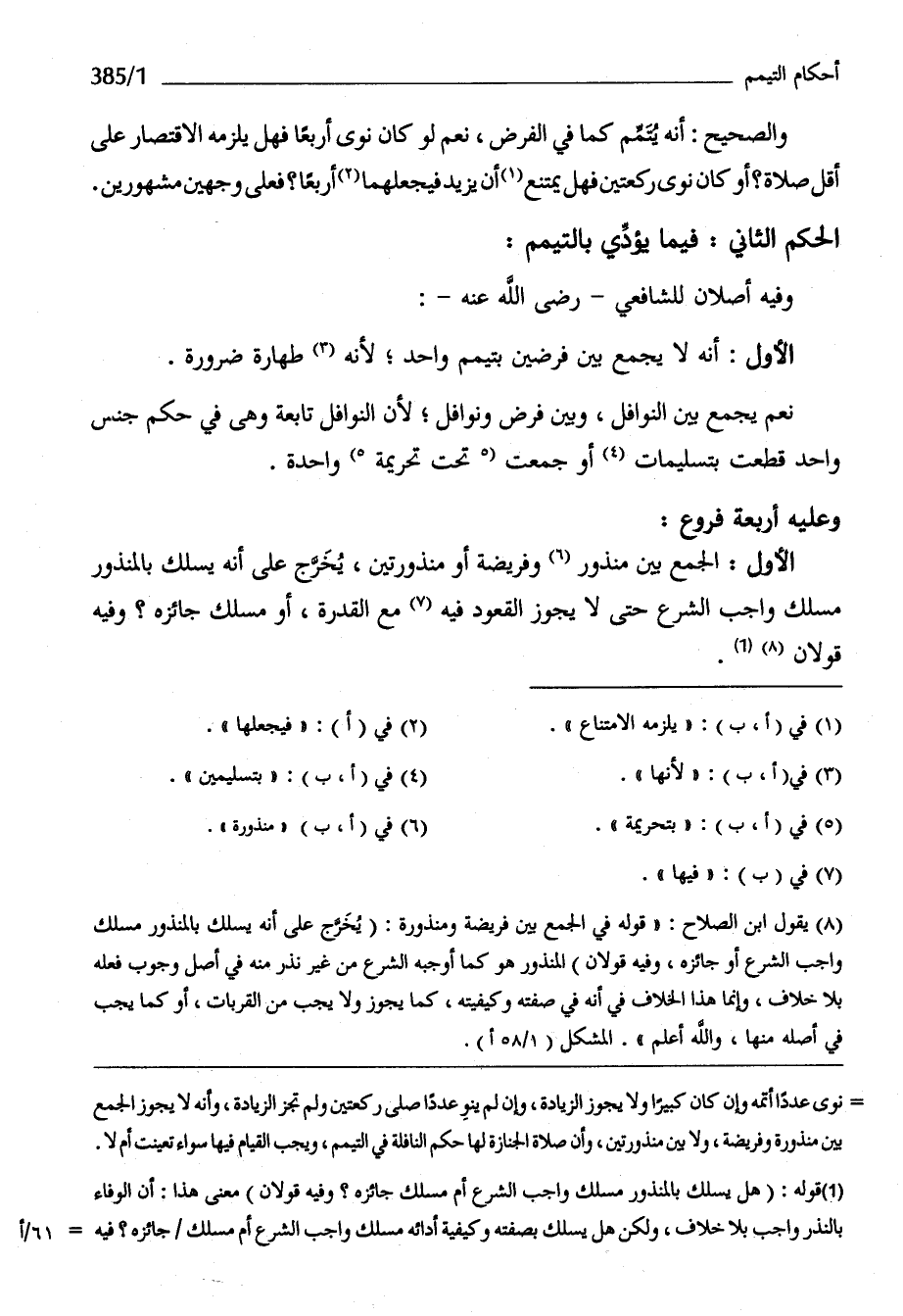 الأول الْجمع بَين منذور وفريضة أَو منذورتين يخرج على أَنه يسْلك بالمنذور مَسْلَك وَاجِب الشَّرْع حَتَّى لَا يجوز الْقعُود فِيهِ مَعَ الْقُدْرَة أَو مَسْلَك جائزه وَفِيه قَولَانِ