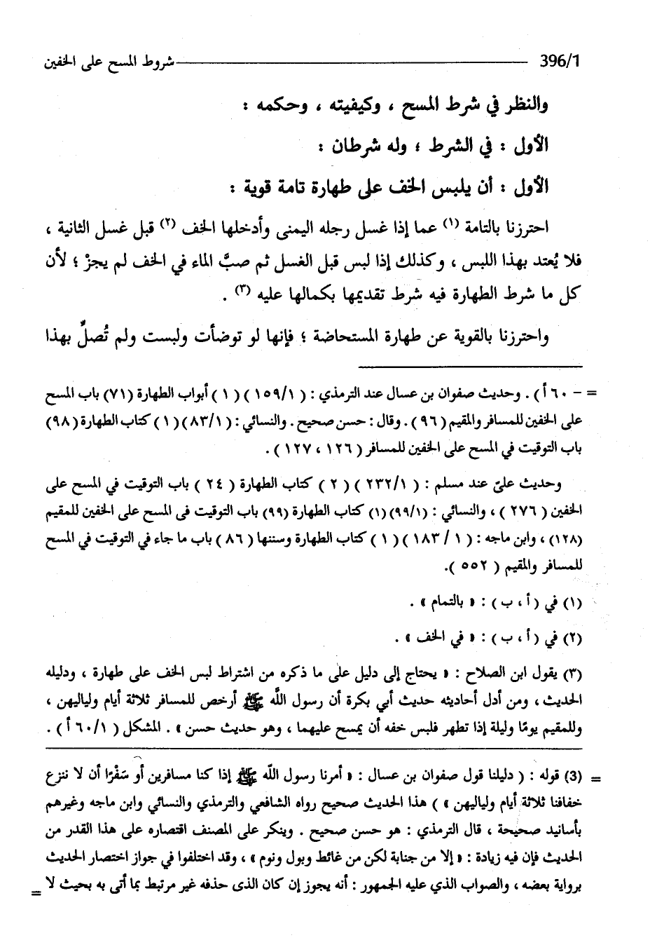وَالنَّظَر فى شَرط الْمسْح وكيفيته وَحكمه الأول فِي الشَّرْط وَله شَرْطَانِ