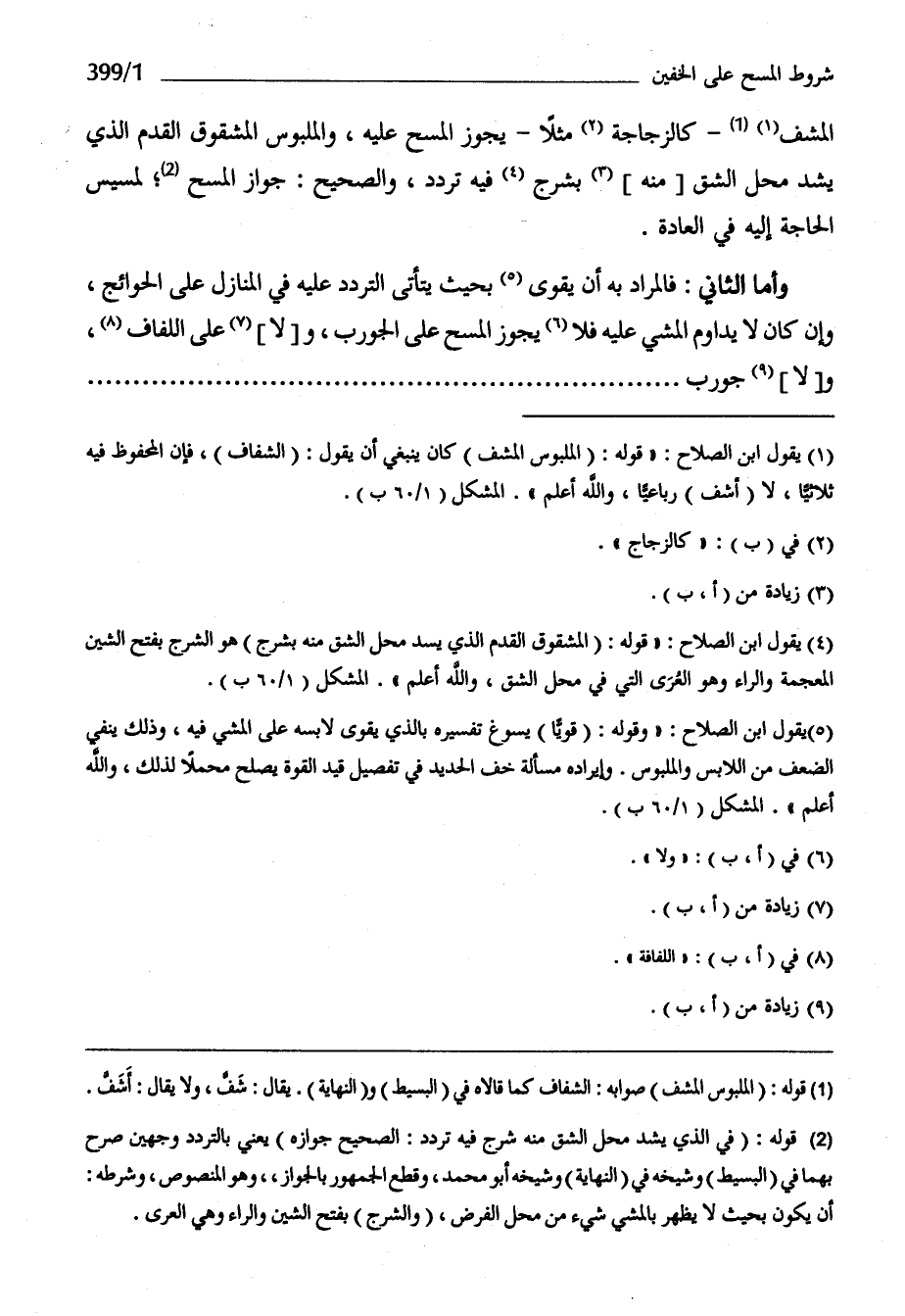 المشف كالزجاجة مثلا يجوز الْمسْح عَلَيْهِ والملبوس المشقوق الْقدَم الَّذِي يشد مَحل الشق مِنْهُ بشرج فِيهِ تردد وَالصَّحِيح جَوَاز الْمسْح لمسيس الْحَاجة إِلَيْهِ فى الْعَادة