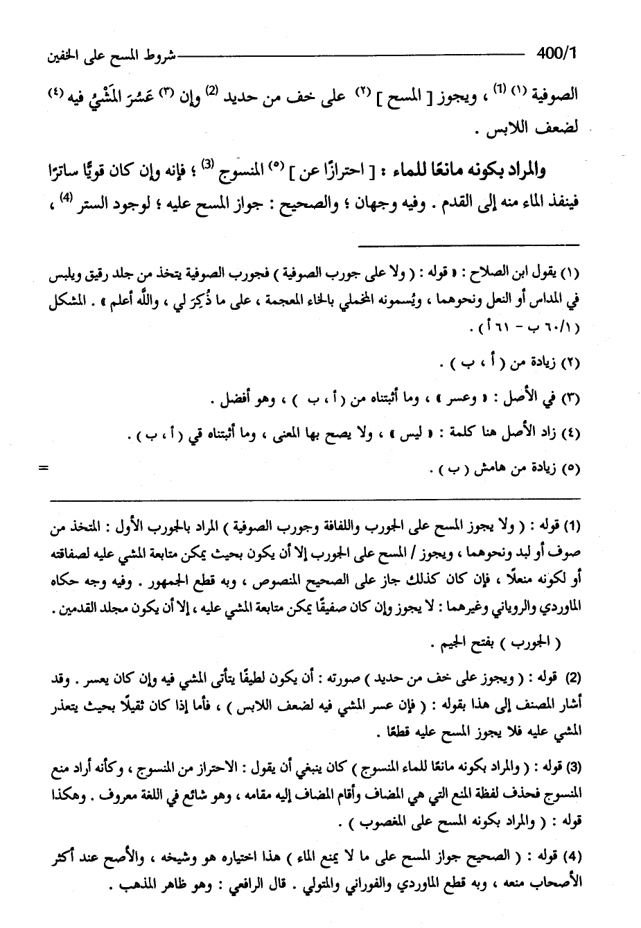 وَالْمرَاد بِكَوْنِهِ مَانِعا للْمَاء احْتِرَازًا عَن المنسوج فَإِنَّهُ وَإِن كَانَ قَوِيا ساترا فَينفذ المَاء مِنْهُ إِلَى الْقدَم وَفِيه وَجْهَان وَالصَّحِيح جَوَاز الْمسْح عَلَيْهِ لوُجُود السّتْر