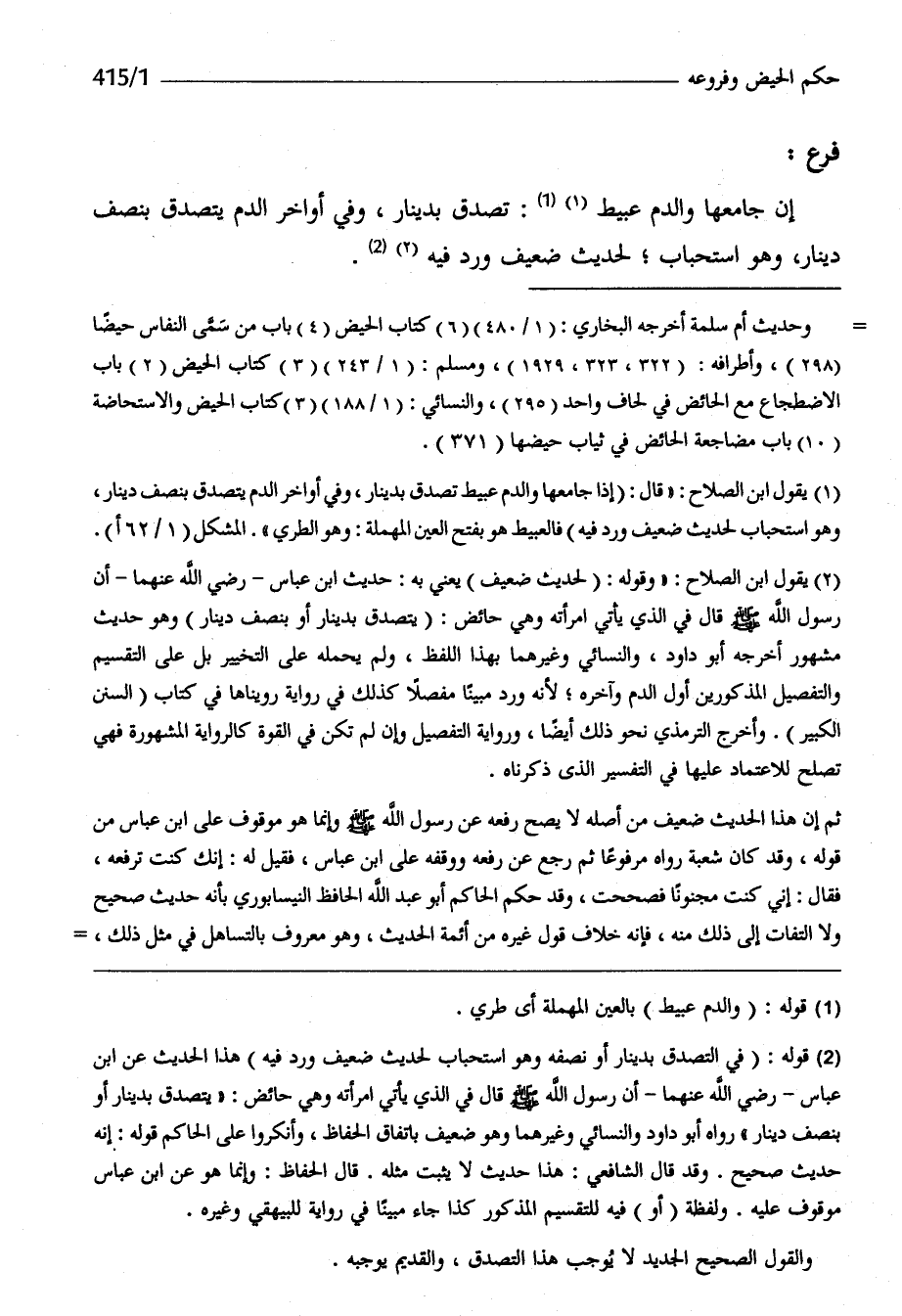 إِن جَامعهَا وَالدَّم عبيط تصدق بِدِينَار وَفِي أَوَاخِر الدَّم يتَصَدَّق بِنصْف دِينَار وَهُوَ اسْتِحْبَاب لحَدِيث ضَعِيف ورد فِيهِ