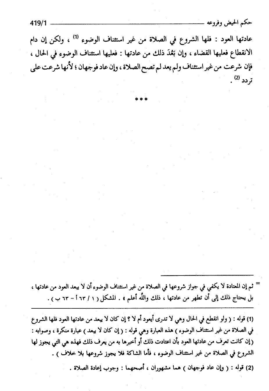 عَادَتهَا الْعود فلهَا الشُّرُوع فى الصَّلَاة من غير اسْتِئْنَاف الْوضُوء وَلَكِن إِن دَامَ الِانْقِطَاع فعلَيْهَا الْقَضَاء وَإِن بعد ذَلِك من عَادَتهَا فعلَيْهَا اسْتِئْنَاف الْوضُوء فِي الْحَال فَإِن شرعت من غير اسْتِئْنَاف وَلم يعد لم تصح الصَّلَاة وَإِن عَاد فَوَجْهَانِ لِأَنَّهَا شرعت على تردد