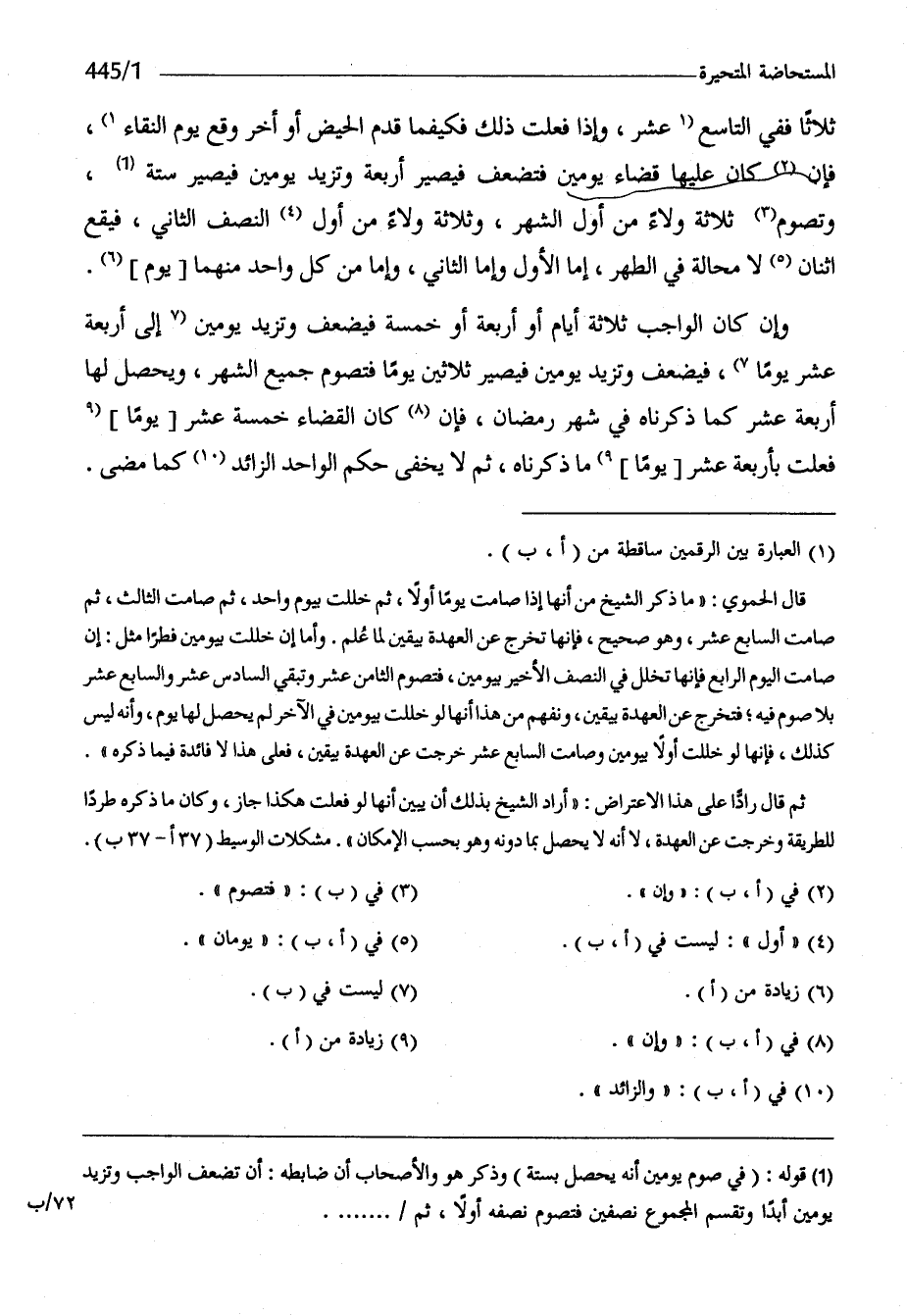 ثَلَاثًا فَفِي التَّاسِع عشر وَإِذا فعلت ذَلِك فكيفما قدم الْحيض أَو أخر وَقع يَوْم النَّقَاء فَإِن كَانَ عَلَيْهَا قَضَاء يَوْمَيْنِ فتضعف فَيصير أَرْبَعَة وتزيد يَوْمَيْنِ فَيصير سِتَّة وتصوم ثَلَاثَة وَلَاء من أول الشَّهْر وَثَلَاثَة وَلَاء من أول النّصْف الثَّانِي فَيَقَع اثْنَان لَا محَالة فِي الطُّهْر إِمَّا الأول وَإِمَّا الثَّانِي وَإِمَّا من كل وَاحِد مِنْهُمَا يَوْم