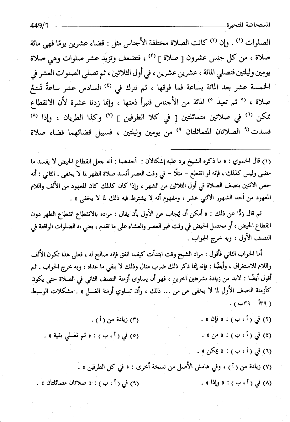 الصَّلَوَات وَإِن كَانَت الصَّلَاة مُخْتَلفَة الْأَجْنَاس مثل قَضَاء عشْرين يَوْمًا فَهِيَ مائَة صَلَاة من كل جنس عشرُون صَلَاة فتضعف وتزيد عشر صلوَات وَهِي صَلَاة يَوْمَيْنِ وليلتين فَتُصَلِّي الْمِائَة عشْرين عشْرين فى أول الثَّلَاثِينَ ثمَّ تصلي الصَّلَوَات الْعشْر فِي الْخَمْسَة عشر بعد الْمِائَة بساعة فَمَا فَوْقهَا ثمَّ تتْرك فِي السَّادِس عشر سَاعَة تسع صَلَاة ثمَّ تعيد الْمِائَة من الْأَجْنَاس فتبرأ ذمَّتهَا وَإِنَّمَا زِدْنَا عشرَة لِأَن الِانْقِطَاع مُمكن فِي صَلَاتَيْنِ متماثلتين فِي كلا الطَّرفَيْنِ وَكَذَا الطريان وَإِذا فَسدتْ الصَّلَاتَان المتماثلتان من يَوْمَيْنِ وليلتين فسبيل قضائهما قَضَاء صَلَاة