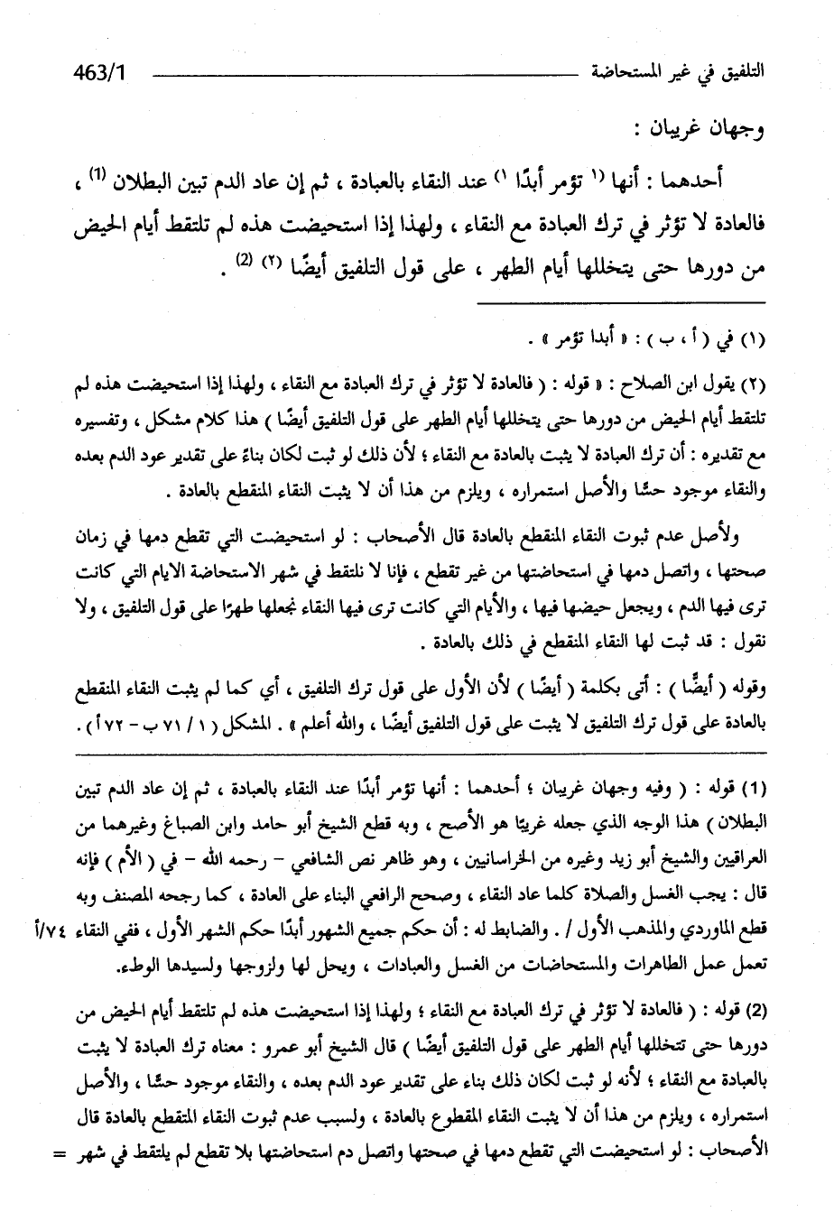 أَحدهمَا أَنَّهَا تُؤمر أبدا عِنْد النَّقَاء بِالْعبَادَة ثمَّ إِن عَاد الدَّم تبين الْبطلَان فالعادة لَا تُؤثر فِي ترك الْعِبَادَة مَعَ النَّقَاء وَلِهَذَا إِذا استحيضت هَذِه لم تلْتَقط أَيَّام الْحيض من دورها حَتَّى يتخللها أَيَّام الطُّهْر على قَول التلفيق أَيْضا
