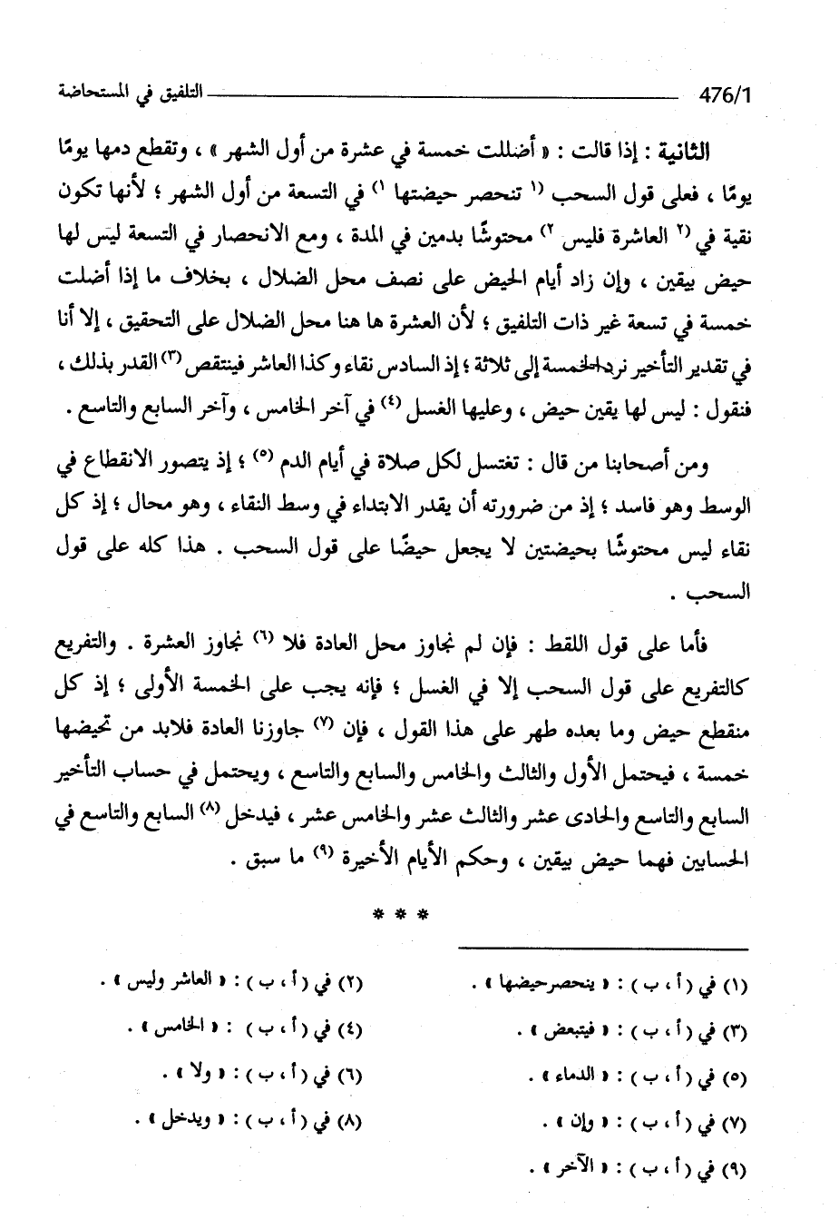 الثَّانِيَة إِذا قَالَت أضللت خَمْسَة فِي عشرَة من أول الشَّهْر وتقطع دَمهَا يَوْمًا يَوْمًا فعلى قَول السحب تَنْحَصِر حَيْضَتهَا فِي التِّسْعَة من أول الشَّهْر لِأَنَّهُ تكون نقية فِي الْعَاشِرَة فَلَيْسَ محتوشا بدمين فِي الْمدَّة وَمَعَ الانحصار فِي التِّسْعَة لَيْسَ لَهَا حيض بِيَقِين وَإِن زَاد أَيَّام الْحيض على نصف مَحل الضلال بِخِلَاف مَا إِذا أضلت خَمْسَة فى تِسْعَة غير ذَات التلفيق لِأَن الْعشْرَة هَاهُنَا مَحل الضلال على التَّحْقِيق إِلَّا أَنا فِي تَقْدِير التَّأْخِير نرد الْخَمْسَة إِلَى ثَلَاثَة إِذْ السَّادِس نقاء وَكَذَا الْعَاشِر فينتقص الْقدر بذلك فَنَقُول لَيْسَ لَهَا يَقِين حيض وَعَلَيْهَا الْغسْل فِي آخر الْخَامِس وَآخر السَّابِع وَالتَّاسِع