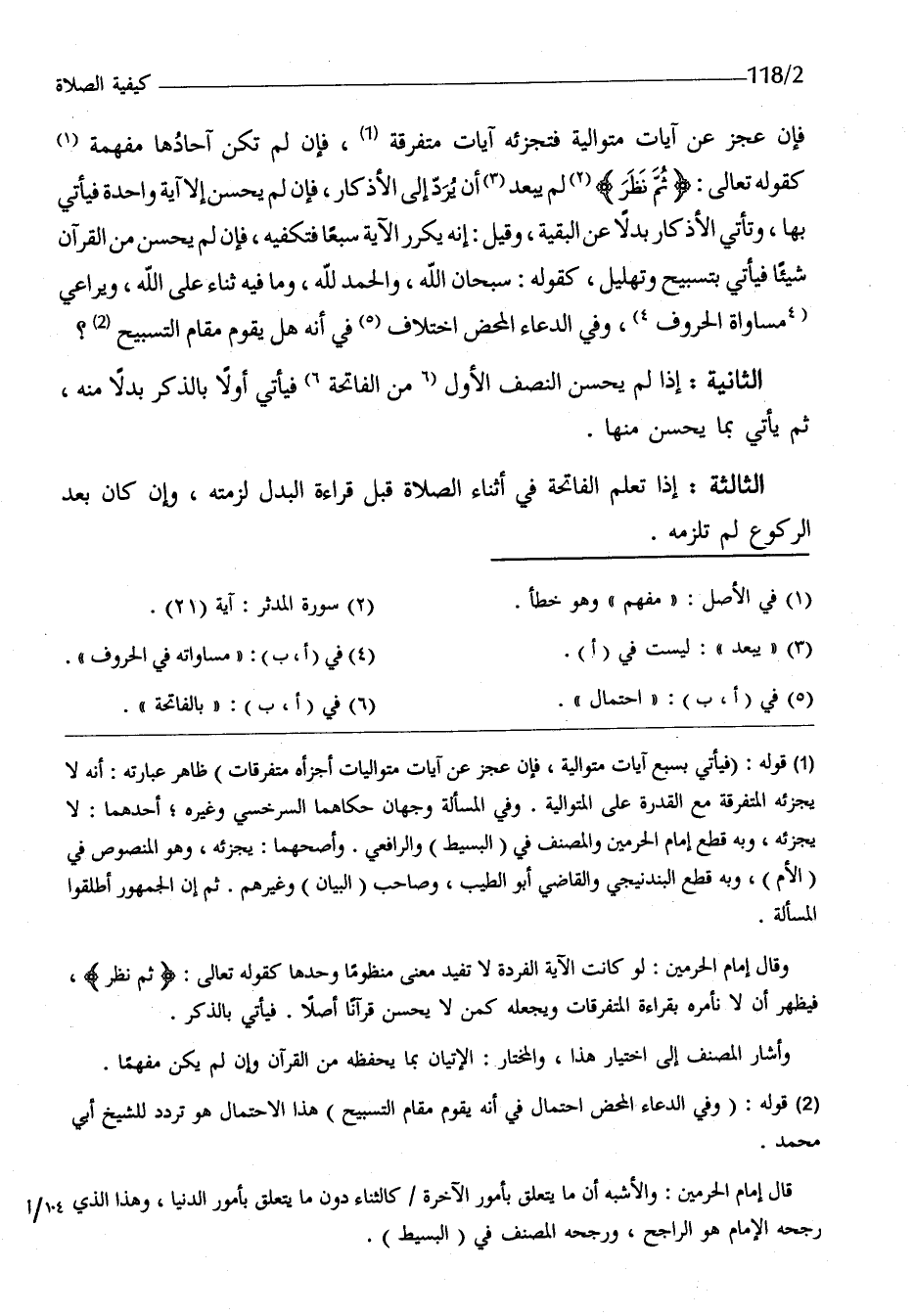 فَإِن عجز عَن آيَات مُتَوَالِيَة فتجزئه آيَات مُتَفَرِّقَة فَإِن لم تكن آحادها مفهمة كَقَوْلِه تَعَالَى {ثمَّ نظر} لم يبعد أَن يرد إِلَى الْأَذْكَار فَإِن لم يحسن إِلَّا آيَة وَاحِدَة فَيَأْتِي بهَا وَتَأْتِي الْأَذْكَار بَدَلا عَن الْبَقِيَّة وَقيل إِنَّه يُكَرر الْآيَة سبعا فتكفيه فَإِن لم يحسن من الْقُرْآن شَيْئا فَيَأْتِي بتسبيح وتهليل كَقَوْلِه سُبْحَانَ الله وَالْحَمْد لله وَمَا فِيهِ ثَنَاء على الله ويراعي مُسَاوَاة الْحُرُوف وَفِي الدُّعَاء الْمَحْض اخْتِلَاف فِي أَنه هَل يقوم مقَام التَّسْبِيح