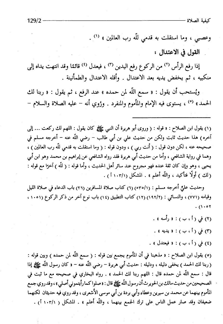 إِذا رفع الرَّأْس من الرُّكُوع رفع الْيَدَيْنِ فيعدل قَائِما وَقد انْتَهَت يَدَاهُ إِلَى مَنْكِبَيْه ثمَّ يخْفض يَدَيْهِ بعد الِاعْتِدَال وَأقله الِاعْتِدَال والطمأنينة