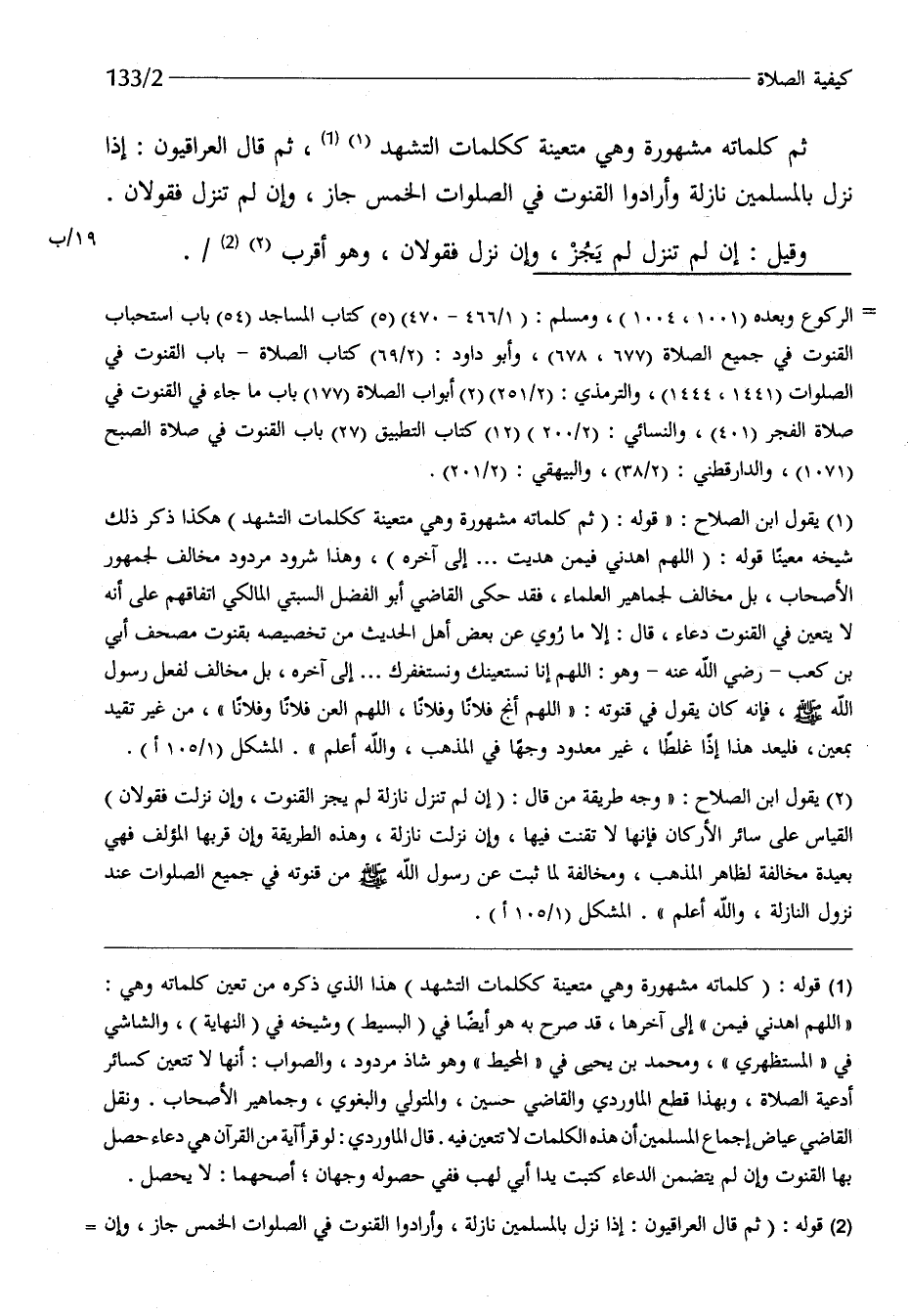 ثمَّ كَلِمَاته مَشْهُورَة وَهِي متعينة ككلمات التَّشَهُّد ثمَّ قَالَ الْعِرَاقِيُّونَ إِذا نزل بِالْمُسْلِمين نازلة وَأَرَادُوا الْقُنُوت فِي الصَّلَوَات الْخمس جَازَ وَإِن لم تنزل فَقَوْلَانِ