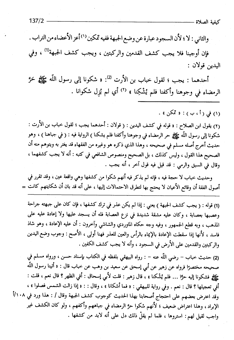 أَحدهمَا يجب لقَوْل خباب بن الْأَرَت شَكَوْنَا إِلَى رَسُول الله صلى الله عَلَيْهِ وَسلم حر الرمضاء فِي وُجُوهنَا وأكفنا فَلم يشكنا أَي لم يزل شكوانا