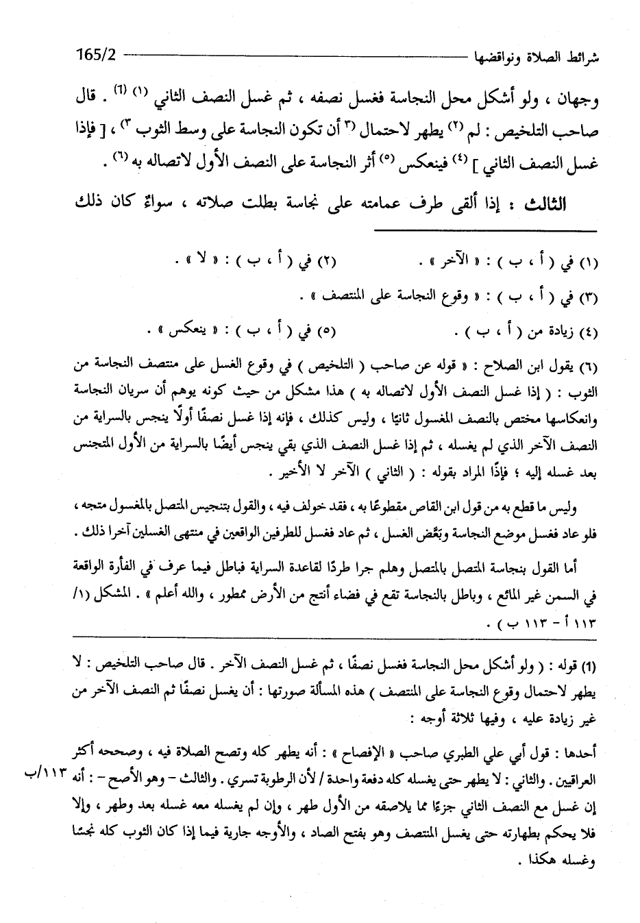 وَجْهَان وَلَو أشكل مَحل النَّجَاسَة فَغسل نصفه ثمَّ غسل النّصْف الثَّانِي قَالَ صَاحب التَّلْخِيص لم يطهر لاحْتِمَال أَن تكون النَّجَاسَة على وسط الثَّوْب فَإِذا غسل النّصْف الثَّانِي فينعكس أثر النَّجَاسَة على النّصْف الأول لاتصاله بِهِ
