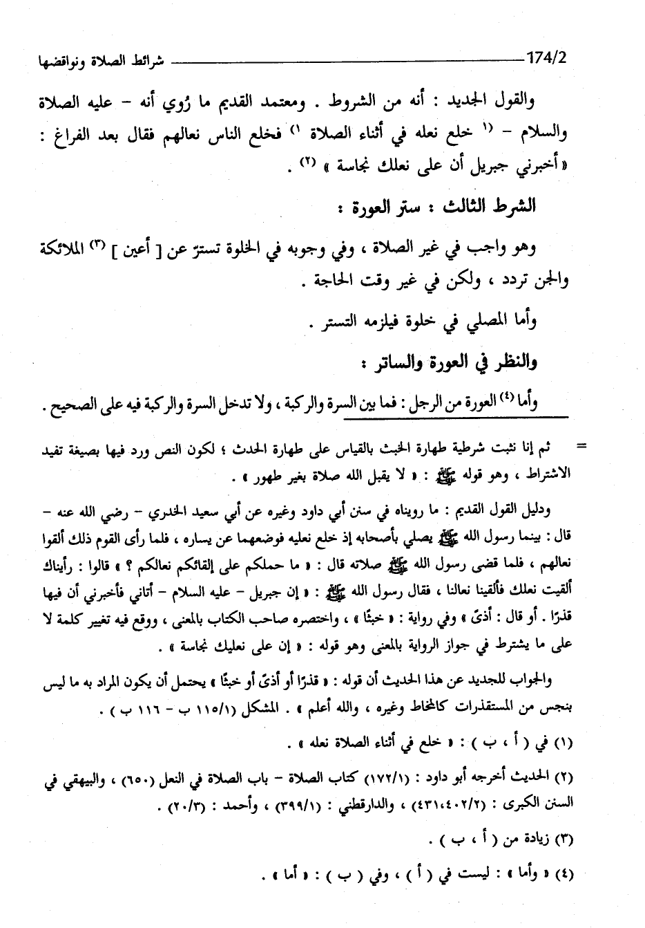 وَالْقَوْل الْجَدِيد أَنه من الشُّرُوط ومعتمد الْقَدِيم مَا رُوِيَ أَنه عَلَيْهِ الصَّلَاة وَالسَّلَام خلع نَعله فِي أثْنَاء الصَّلَاة فَخلع النَّاس نعَالهمْ فَقَالَ بعد الْفَرَاغ أَخْبرنِي جِبْرِيل أَن على نعلك نَجَاسَة