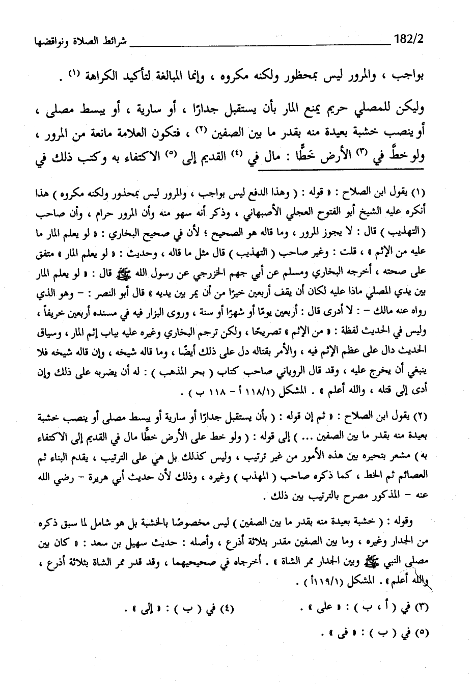 وَليكن للْمُصَلِّي حَرِيم يمْنَع الْمَار بِأَن يسْتَقْبل جدارا أَو سَارِيَة أَو يبسط مصلى أَو ينصب خَشَبَة بعيدَة مِنْهُ بِقدر مَا بَين الصفين فَتكون الْعَلامَة مَانِعَة من الْمُرُور وَلَو خطّ فِي الأَرْض خطا مَال فِي الْقَدِيم إِلَى الِاكْتِفَاء بِهِ وَكتب ذَلِك فِي