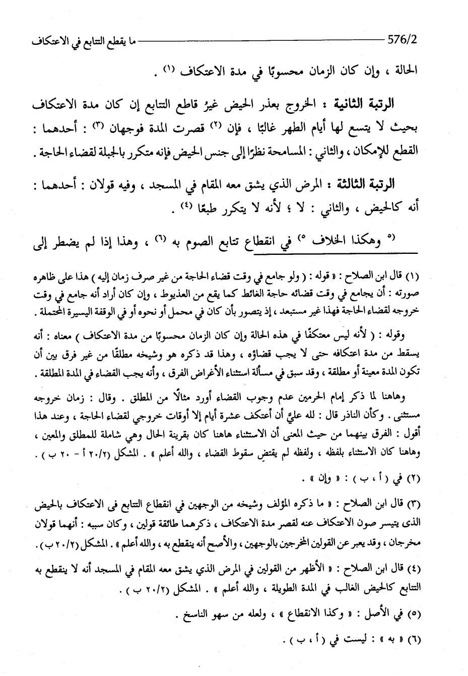 الرُّتْبَة الثَّانِيَة الْخُرُوج بِعُذْر الْحيض غير قَاطع التَّتَابُع إِن كَانَ مُدَّة الِاعْتِكَاف بِحَيْثُ لَا يَتَّسِع لَهَا أَيَّام الطُّهْر غَالِبا فَإِن قصرت الْمدَّة فَوَجْهَانِ أَحدهمَا الْقطع للإمكان وَالثَّانِي الْمُسَامحَة نظرا إِلَى جنس الْحيض فَإِنَّهُ متكرر بالجبلة لقَضَاء الْحَاجة