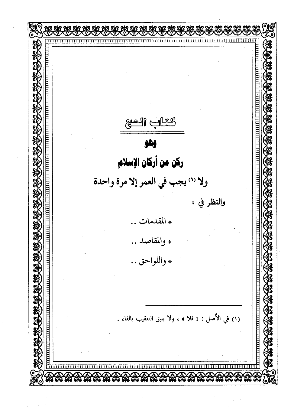= كتاب الْحَج = وَهُوَ ركن من أَرْكَان الْإِسْلَام وَلَا يجب فِي الْعُمر إِلَّا مرّة وَاحِد وَالنَّظَر فِي الْمُقدمَات والمقاصد واللواحق