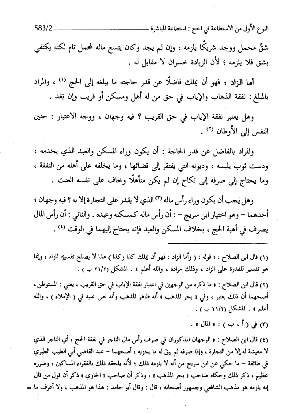 وَهل يجب أَن يكون وَرَاء رَأس مَاله الذى لَا يقدر على التِّجَارَة إِلَّا بِهِ فِيهِ وَجْهَان أَحدهمَا وَهُوَ اخْتِيَار ابْن سُرَيج أَن رَأس مَاله كمسكنه وَعَبده وَالثَّانِي أَن رَأس المَال يصرف فِي أهبة الْحَج بِخِلَاف الْمسكن وَالْعَبْد فَإِنَّهُ يحْتَاج إِلَيْهِمَا فِي الْوَقْت