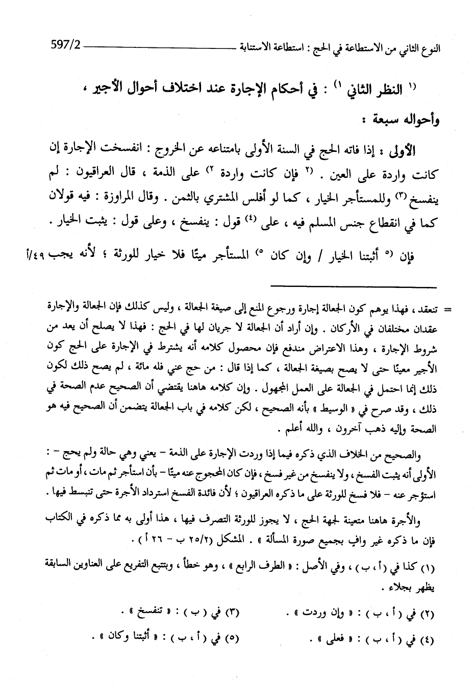 الأولى إِذا فَاتَهُ الْحَج فِي السّنة الأولى بامتناعه عَن الْخُرُوج انْفَسَخت الْإِجَارَة إِن كَانَت وَارِدَة على الْعين فَإِن كَانَت وَارِدَة على الذِّمَّة قَالَ الْعِرَاقِيُّونَ لم يَنْفَسِخ وللمستأجر الْخِيَار كَمَا لَو أفلس المُشْتَرِي بِالثّمن وَقَالَ المراوزة فِيهِ قَولَانِ كَمَا فِي انْقِطَاع جنس الْمُسلم فِيهِ على قَول يَنْفَسِخ وعَلى قَول يثبت الْخِيَار