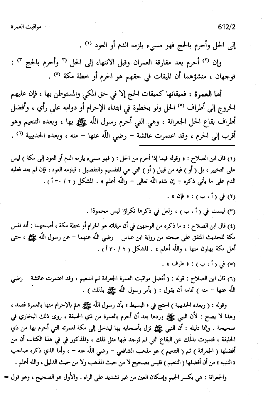 أما الْعمرَة فميقاتها كميقات الْحَج إِلَّا فِي حق الْمَكِّيّ والمستوطن بهَا فَإِن عَلَيْهِم الْخُرُوج إِلَى أَطْرَاف الْحل وَلَو بخطوة فِي ابْتِدَاء الْإِحْرَام أَو دَوَامه على رَأْي وَأفضل أَطْرَاف بقاع الْحل الْجِعِرَّانَة وَهِي الَّتِي أحرم رَسُول الله صلى الله عَلَيْهِ وَسلم بهَا وَبعده التَّنْعِيم وَهُوَ أقرب إِلَى الْحرم وَقد اعْتَمَرت عَائِشَة رَضِي الله عَنْهَا مِنْهُ وَبعده الْحُدَيْبِيَة
