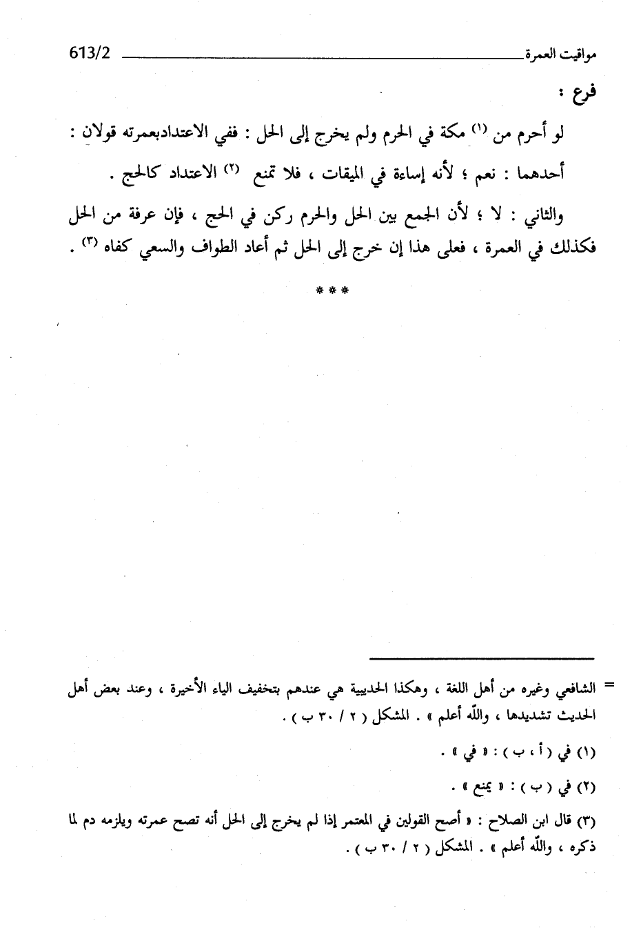 وَالثَّانِي لَا لِأَن الْجمع بَين الْحل وَالْحرم ركن فِي الْحَج فَإِن عَرَفَة من الْحل فَكَذَلِك فِي الْعمرَة فعلى هَذَا إِن خرج إِلَى الْحل ثمَّ أعَاد الطّواف وَالسَّعْي كَفاهُ