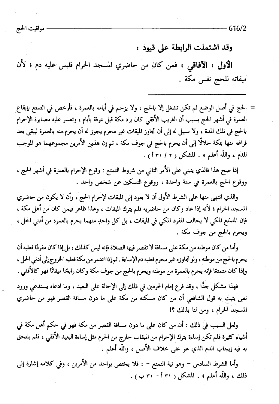 الأول الآفاقي فَمن كَانَ من حاضري الْمَسْجِد الْحَرَام فَلَيْسَ عَلَيْهِ دم لِأَن مِيقَاته لِلْحَجِّ نفس مَكَّة