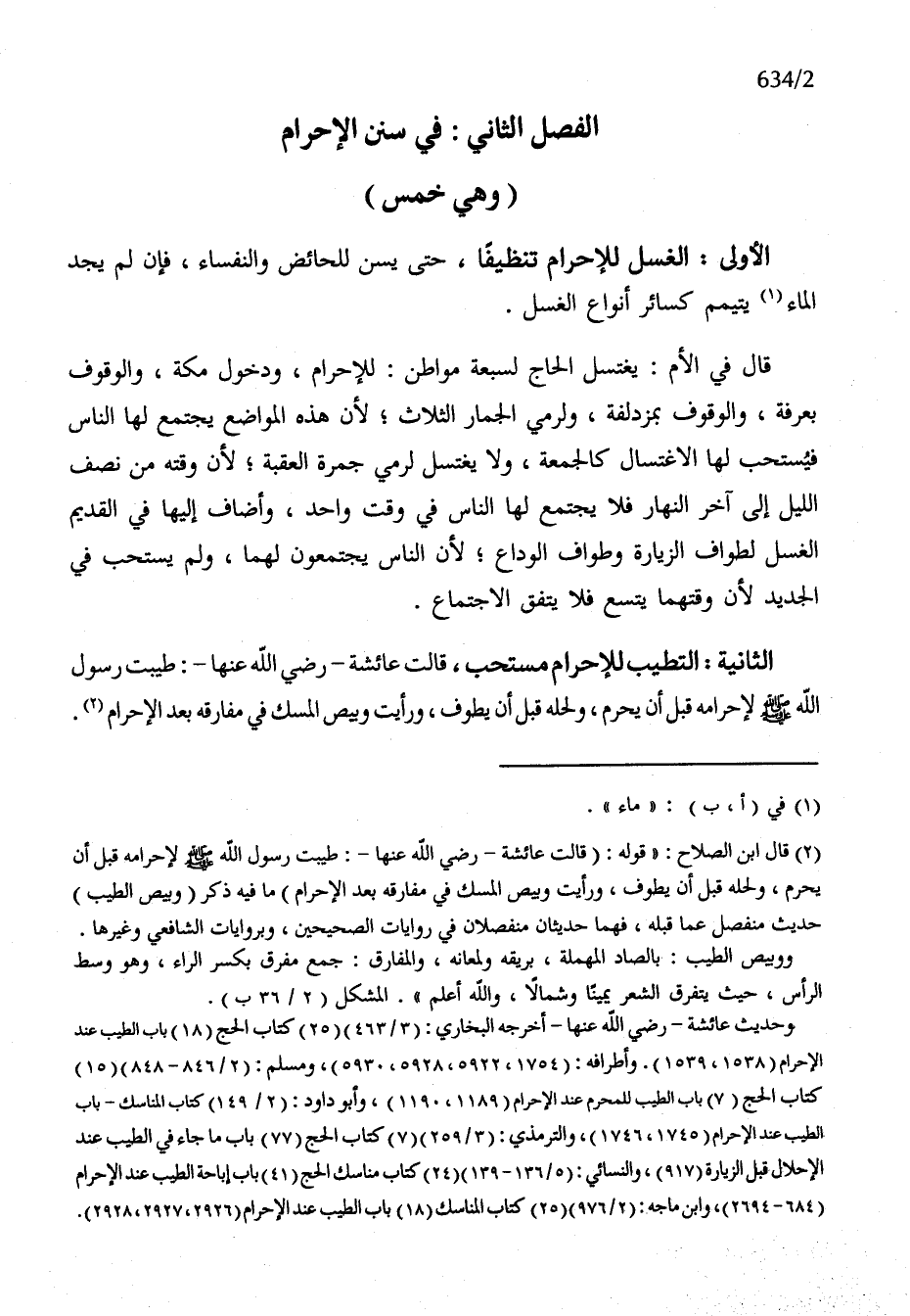 الثَّانِيَة التَّطَيُّب للْإِحْرَام مُسْتَحبّ قَالَت عَائِشَة رَضِي الله عَنْهَا طيبت رَسُول الله صلى الله عَلَيْهِ وَسلم لإحرامه قبل أَن يحرم ولحله قبل أَن يطوف وَرَأَيْت وبيص الْمسك فِي مفارقه بعد الْإِحْرَام