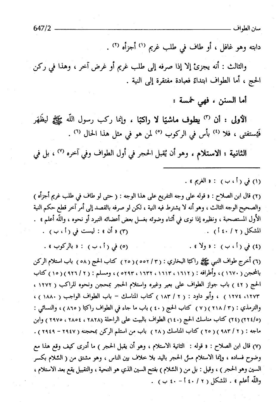 الأولى أَن يطوف مَاشِيا لَا رَاكِبًا وَإِنَّمَا ركب رَسُول الله صلى الله عَلَيْهِ وَسلم ليظْهر فيستفتى فَلَا بَأْس فِي الرّكُوب لمن هُوَ فِي مثل هَذَا الْحَال