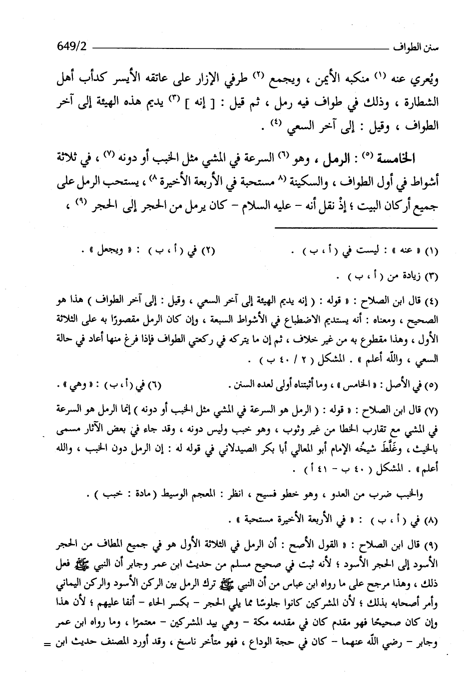 الْخَامِسَة الرمل وَهُوَ السرعة فِي الْمَشْي مثل الخبب أَو دونه فِي ثَلَاثَة أَشْوَاط فِي أول الطّواف والسكينة مُسْتَحبَّة فِي الْأَرْبَعَة الْأَخِيرَة يسْتَحبّ الرمل على جَمِيع أَرْكَان الْبَيْت إِذْ نقل أَنه عَلَيْهِ السَّلَام كَانَ يرمل من الْحجر إِلَى الْحجر