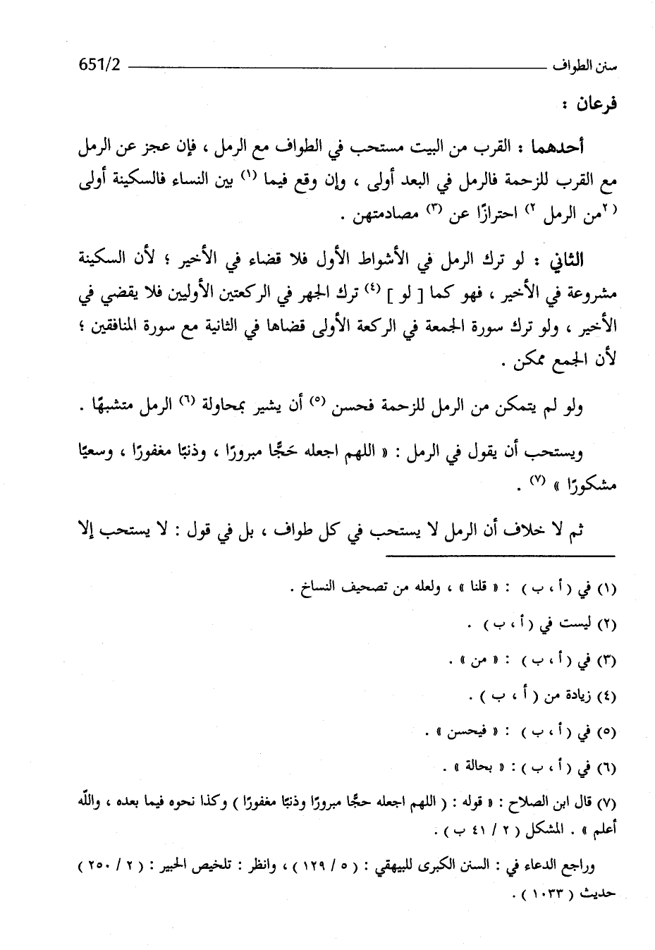 الثَّانِي لَو ترك الرمل فِي الأشواط الأول فَلَا قَضَاء فِي الْأَخير لِأَن السكينَة مَشْرُوعَة فِي الْأَخير فَهُوَ كَمَا لَو ترك الْجَهْر فِي الرَّكْعَتَيْنِ الْأَوليين فَلَا يقْضِي فِي الْأَخير وَلَو ترك سُورَة الْجُمُعَة فِي الرَّكْعَة الأولى قَضَاهَا فِي الثَّانِيَة مَعَ سُورَة الْمُنَافِقين لِأَن الْجمع مُمكن