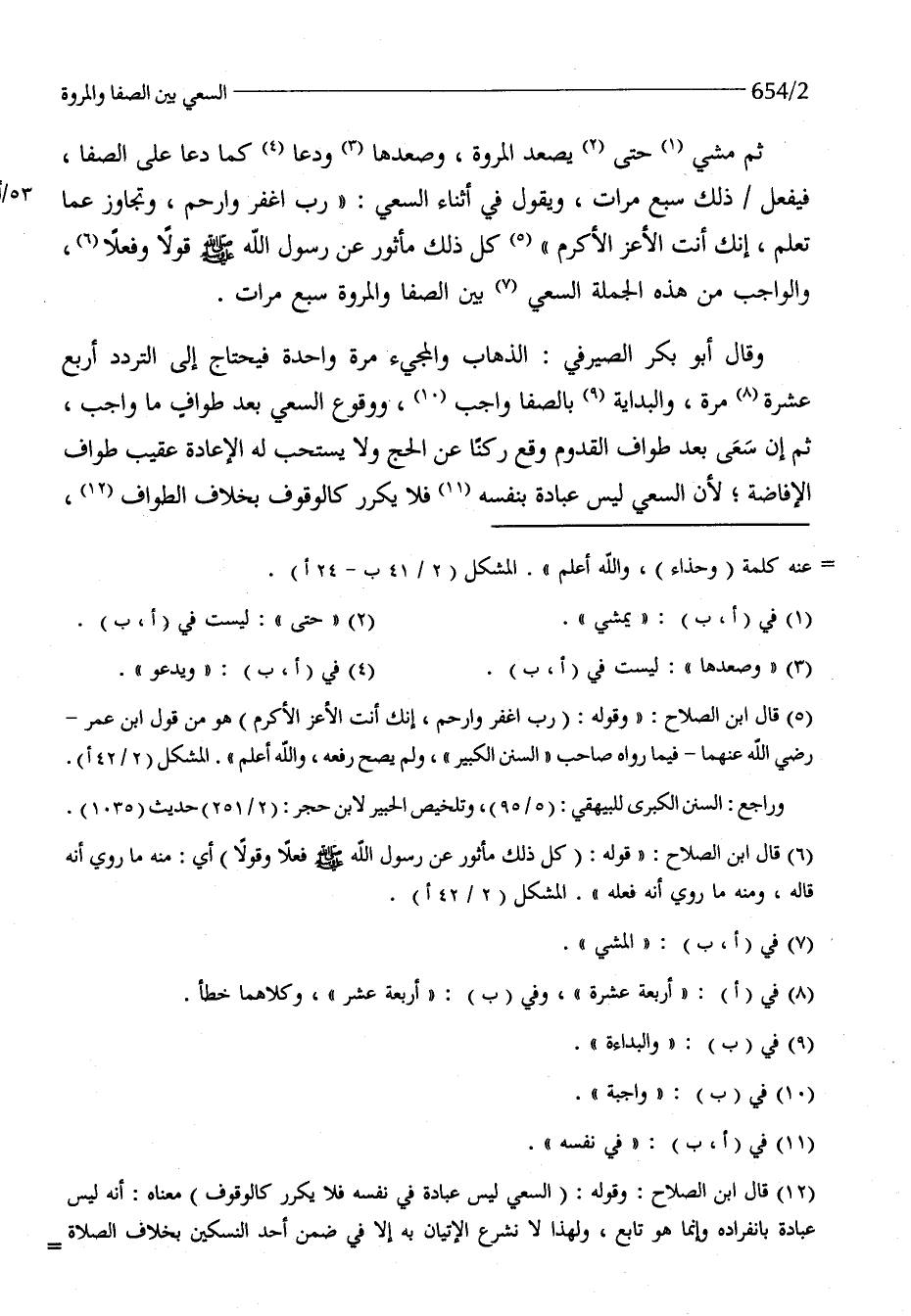 ثمَّ مَشى حَتَّى يصعد الْمَرْوَة وصعدها ودعا كَمَا دَعَا على الصَّفَا فيفعل ذَلِك سبع مَرَّات وَيَقُول فِي أثْنَاء السَّعْي رب اغْفِر وَارْحَمْ وَتجَاوز عَمَّا تعلم إِنَّك أَنْت الْأَعَز الأكرم كل ذَلِك مأثور عَن رَسُول الله صلى الله عَلَيْهِ وَسلم قولا وفعلا وَالْوَاجِب من هَذِه الْجُمْلَة السَّعْي بَين الصَّفَا والمروة سبع مَرَّات