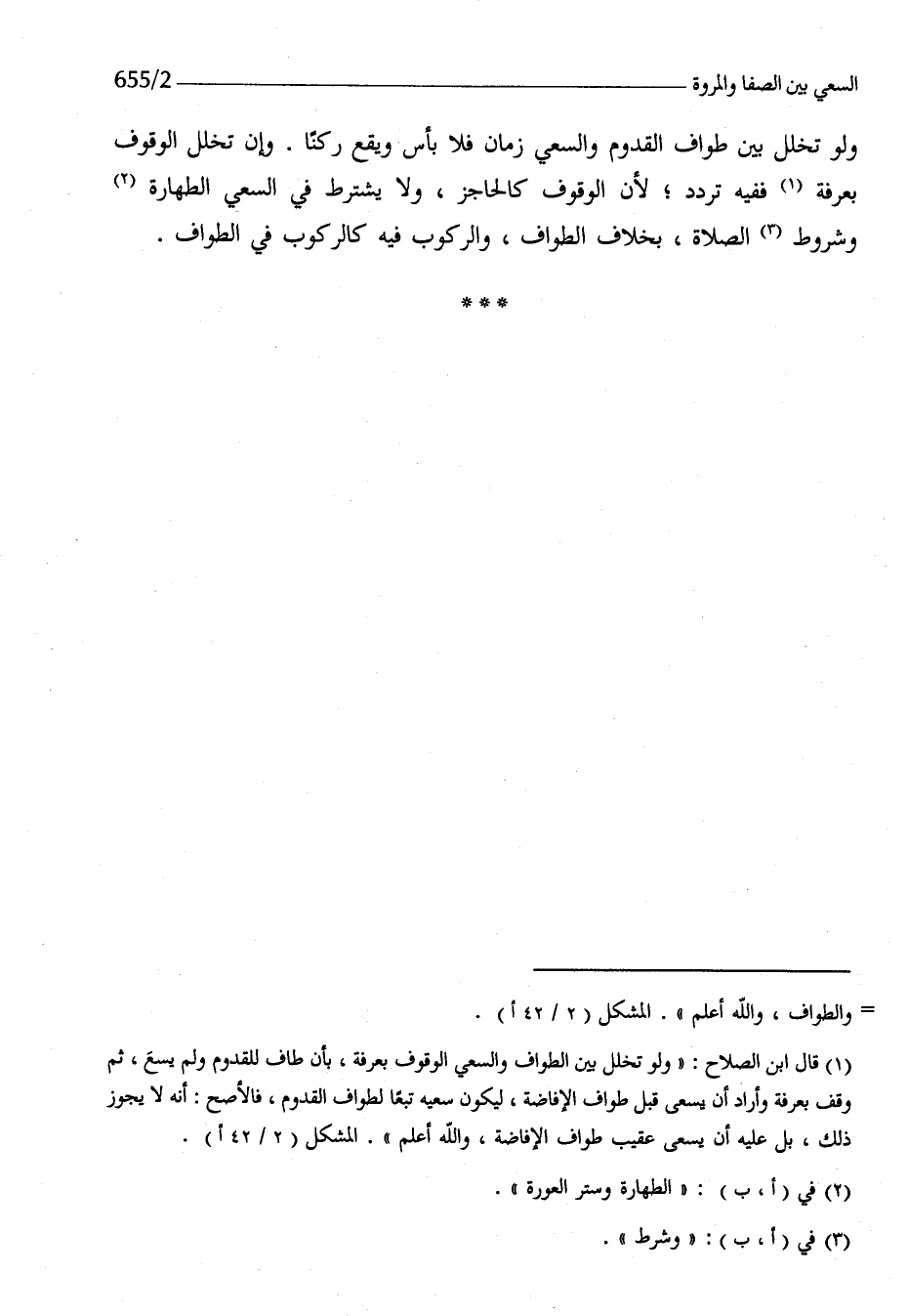 وَلَو تخَلّل بَين طواف الْقدوم وَالسَّعْي زمَان فَلَا بَأْس وَيَقَع ركنا وَإِن تخَلّل الْوُقُوف بِعَرَفَة فَفِيهِ تردد لِأَن الْوُقُوف كالحاجز وَلَا يشْتَرط فِي السَّعْي الطَّهَارَة وشروط الصَّلَاة بِخِلَاف الطّواف وَالرُّكُوب فِيهِ كالركوب فِي الطّواف