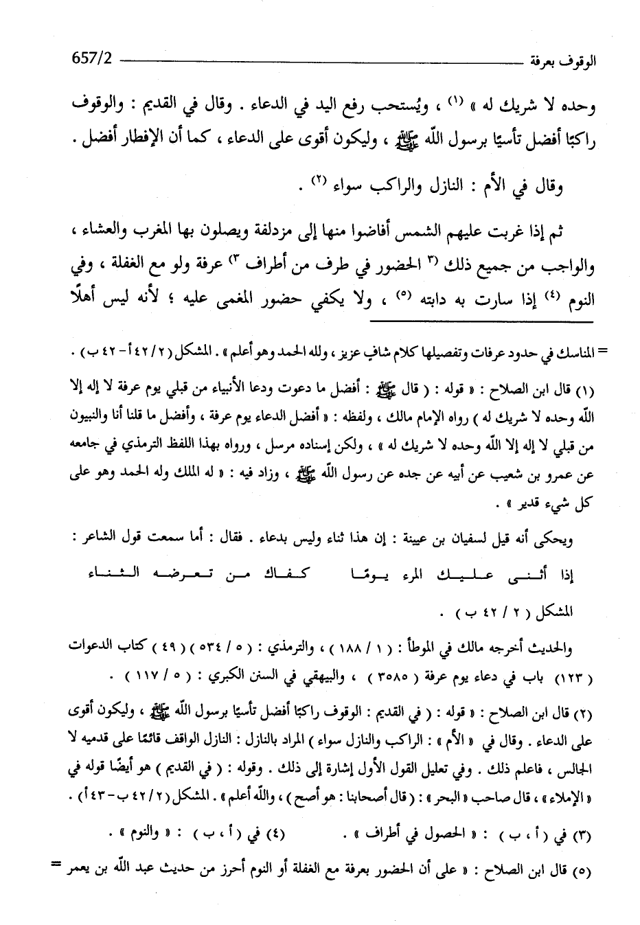 وَحده لَا شريك لَهُ وَيسْتَحب رفع الْيَد فِي الدُّعَاء وَقَالَ فِي الْقَدِيم وَالْوُقُوف رَاكِبًا أفضل تأسيا برَسُول الله صلى الله عَلَيْهِ وَسلم وليكون أقوى على الدُّعَاء كَمَا أَن الْإِفْطَار أفضل