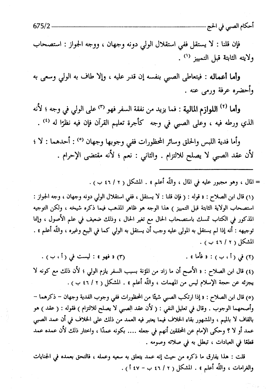 وَأما اللوازم الْمَالِيَّة فَمَا يزِيد من نَفَقَة السّفر فَهُوَ على الْوَلِيّ فِي وَجه لِأَنَّهُ الذى ورطه فِيهِ وعَلى الصَّبِي فِي وَجه كَأُجْرَة تَعْلِيم الْقُرْآن فَإِن فِيهِ نظرا لَهُ