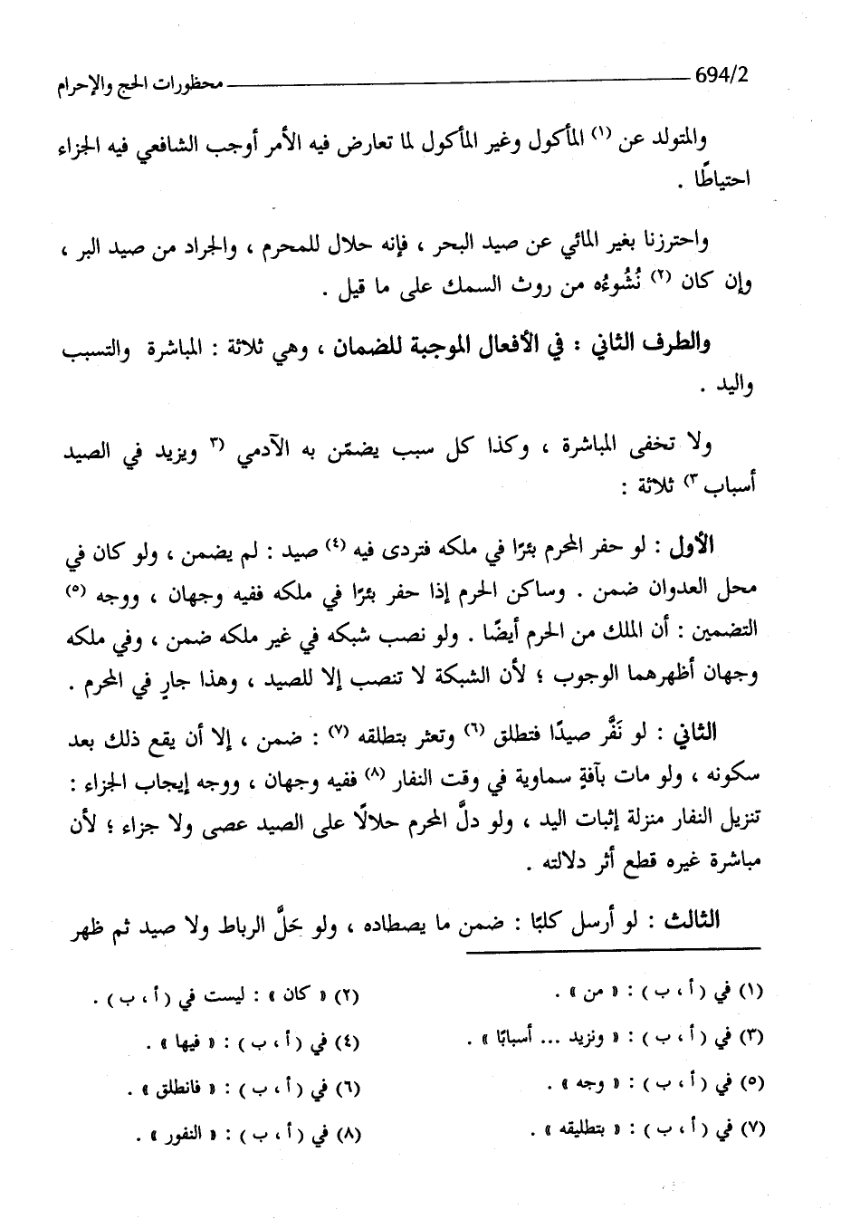 الأول لَو حفر الْمحرم بِئْرا فِي ملكه فتردى فِيهِ صيد لم يضمن وَلَو كَانَ فِي مَحل الْعدوان ضمن وَسَاكن الْحرم إِذا حفر بِئْرا فِي ملكه فَفِيهِ وَجْهَان وَوجه التَّضْمِين أَن الْملك من الْحرم أَيْضا وَلَو نصب شبكه فِي غير ملكه ضمن وَفِي ملكه وَجْهَان أظهرهمَا الْوُجُوب لِأَن الشبكة لَا تنصب إِلَّا للصَّيْد وَهَذَا جَار فِي الْمحرم