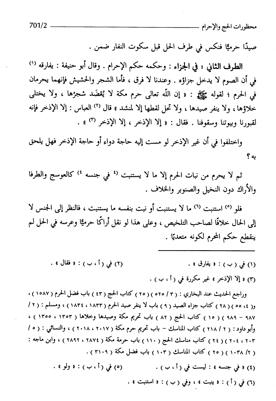 الطّرف الثَّانِي فِي الْجَزَاء وَحكمه حكم الْإِحْرَام وَقَالَ أَبُو حنيفَة يُفَارِقهُ فِي أَن الصَّوْم لَا يدْخل جَزَاؤُهُ وَعِنْدنَا وَلَا فرق فَأَما الشّجر والحشيش فَإِنَّهُمَا يحرمان فِي الْحرم لقَوْله صلى الله عَلَيْهِ وَسلم إِن الله تَعَالَى حرم مَكَّة لَا يعضد شَجَرهَا وَلَا يخْتَلى خلاؤها وَلَا ينفر صيدها وَلَا تحل لقطها إِلَّا لِمُنْشِد قَالَ الْعَبَّاس إِلَّا الْإِذْخر فَإِنَّهُ لِقُبُورِنَا وَبُيُوتنَا وسقوفنا فَقَالَ إِلَّا الْإِذْخر إِلَّا الْإِذْخر