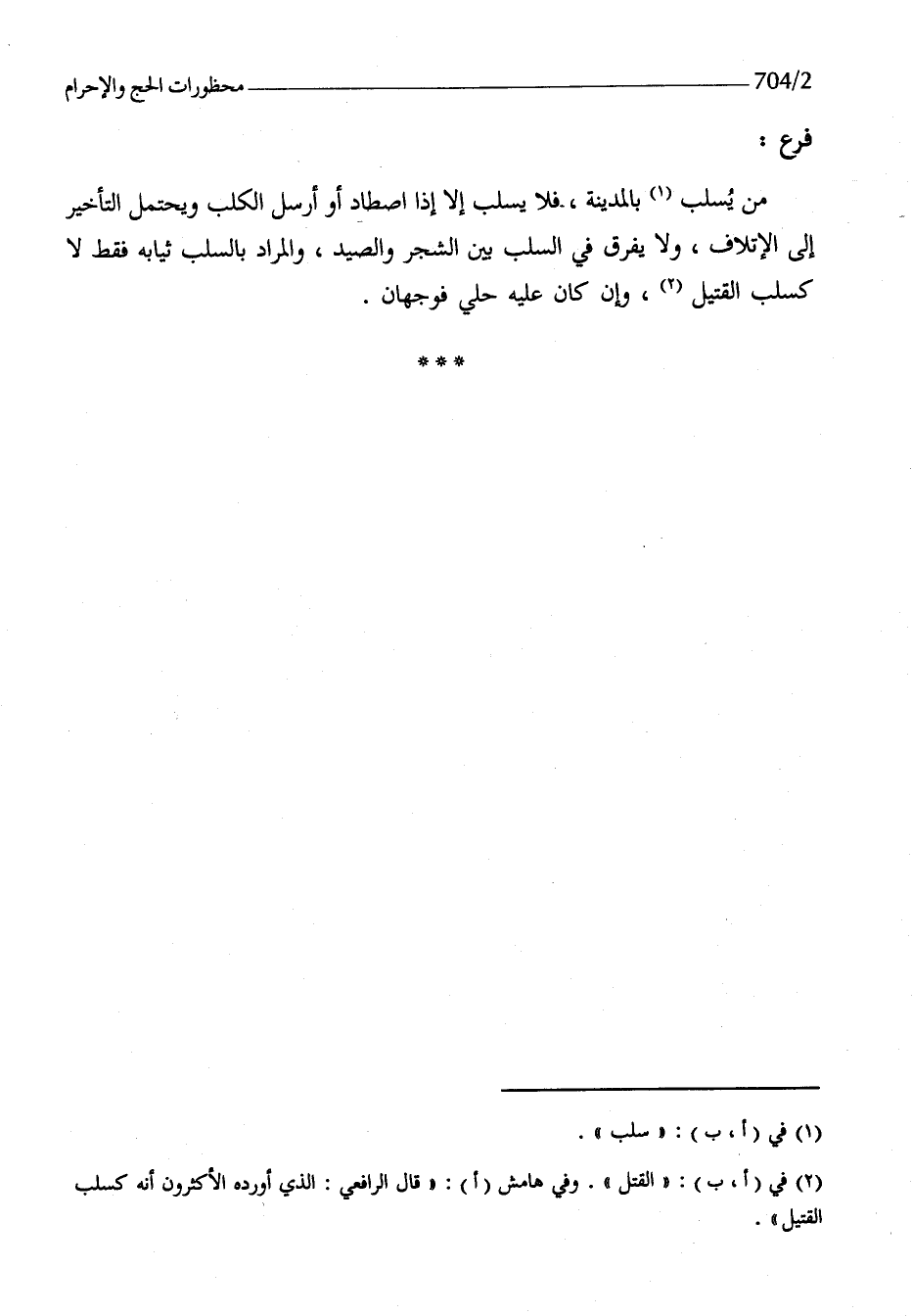 من يسلب بِالْمَدِينَةِ فَلَا يسلب إِلَّا إِذا اصطاد أَو أرسل الْكَلْب وَيحْتَمل التَّأْخِير إِلَى الْإِتْلَاف وَلَا يفرق فِي السَّلب بَين الشّجر وَالصَّيْد وَالْمرَاد بالسلب ثِيَابه فَقَط لَا كسلب الْقَتِيل وَإِن كَانَ عَلَيْهِ حلي فَوَجْهَانِ