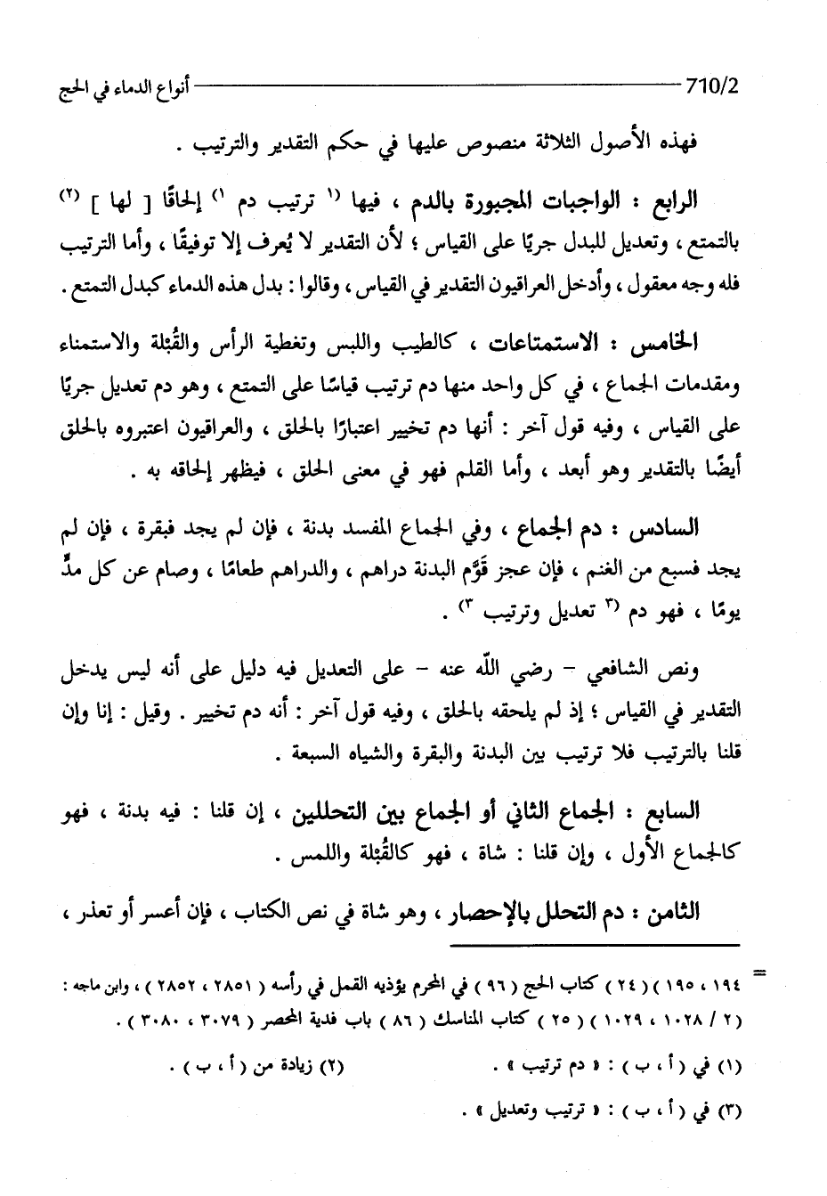 الرَّابِع الْوَاجِبَات المجبورة بِالدَّمِ فِيهَا تَرْتِيب دم إِلْحَاقًا لَهَا بالتمتع وتعديل للبدل جَريا على الْقيَاس لِأَن التَّقْدِير لَا يعرف إِلَّا تَوْفِيقًا وَأما التَّرْتِيب فَلهُ وَجه مَعْقُول وَأدْخل الْعِرَاقِيُّونَ التَّقْدِير فِي الْقيَاس وَقَالُوا بدل هَذِه الدِّمَاء كبدل التَّمَتُّع