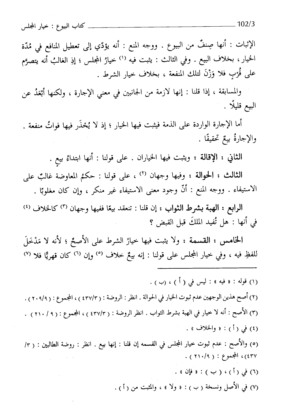 الْإِثْبَات أَنَّهَا صنف من الْبيُوع وَوجه الْمَنْع أَنه يُؤَدِّي إِلَى تَعْطِيل الْمَنَافِع فمدة الْخِيَار بِخِلَاف البيع وَفِي الثَّالِث يثبت فِيهِ خِيَار الْمجْلس إِذْ الْغَالِب انه يتصرم على قرب فَلَا وزن لتِلْك الْمَنْفَعَة بِخِلَاف خِيَار الشَّرْط