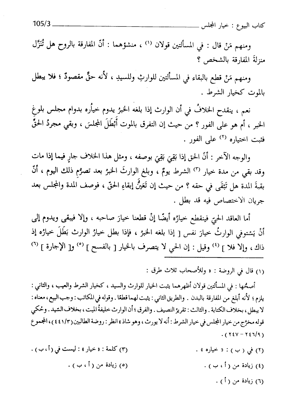 نعم ينقدح الْخلاف فِي أَن الْوَارِث إِذا بلغه الْخَبَر يَدُوم خِيَاره بدوام مجْلِس بُلُوغ الْخَبَر أم هُوَ على الْفَوْر من حَيْثُ إِن التَّفَرُّق بِالْمَوْتِ أبطل الْمجْلس وَبَقِي مُجَرّد الْحق فَثَبت اخْتِيَاره على الْفَوْر
